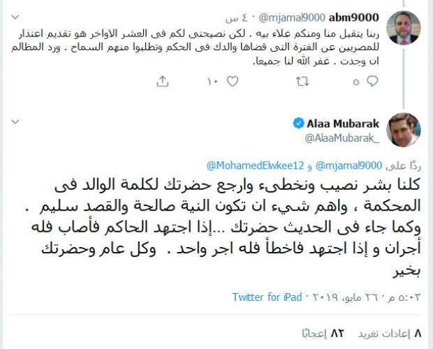 رد علاء مبارك، نجل الرئيس الأسبق حسني مبارك، على أحد متابعيه على موقع التدوينات القصيرة "تويتر" والذي قال له: "ربنا يتقبل منا ومنكم علاء بيه، لكن نصيحتى لكم فى العشر الأواخر هو تقديم اعتذار للمصريين عن الفترة التى قضاها والدك في الحكم وتطلبوا منهم السماح، ورد المظالم إن وجدت، غفر الله لنا جميعا".