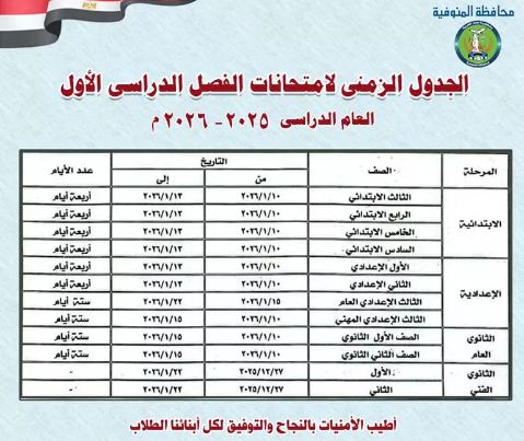 ننشر مواعيد امتحانات الفصل الدراسي الأول 2026 لجميع المراحل بالمنوفية