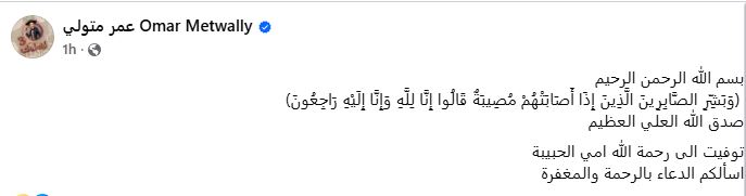 وكتب عمر، عبر صفحته الرسمية على فيسبوك، قائلا: "بسم الله الرحمن الرحيم.. (وَبَشِّرِ الصَّابِرِينَ الَّذِينَ إِذَا أَصَابَتْهُمْ مُصِيبَةٌ قَالُوا إِنَّا لِلَّهِ وَإِنَّا إِلَيْهِ رَاجِعُونَ) صدق الله العلي العظيم، (توفيت الى رحمة الله أمي الحبيبة أسألكم الدعاء بالرحمة والمغفرة)".