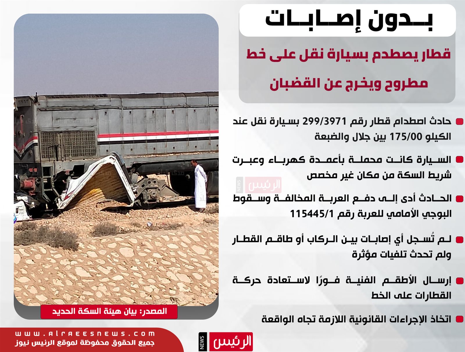 الحادث نجم عن اصطدام القطار بسيارة نقل رقم 2861 ب د هـ، محملة بأعمدة كهرباء، كانت تعبر شريط السكة الحديد من مكان غير مخصص للعبور.
