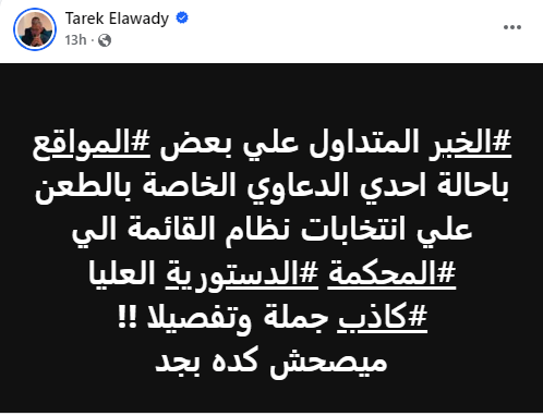 كما نفى المحامي طارق العوضي بشكل قاطع صحة ما تردد حول إحالة إحدى الدعاوى الخاصة بالطعن على انتخابات نظام القائمة إلى المحكمة الدستورية العليا، مؤكدا أن هذه الأنباء غير صحيحة تمامًا ولا أساس لها من الواقع، معقبا: “الخبر كاذب جملة وتفصيلا”.