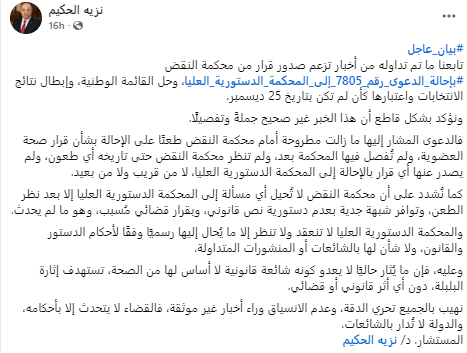 المستشار القانوني الدكتور نزيه الحكيم، نفي صحة الأنباء المتداولة بشأن صدور قرار من محكمة النقض بإحالة الدعوى رقم 7805 إلى المحكمة الدستورية العليا، وما تضمنته من مزاعم حول حل القائمة الوطنية وإبطال نتائج الانتخابات واعتبارها كأن لم تكن اعتبارًا من 25 ديسمبر.