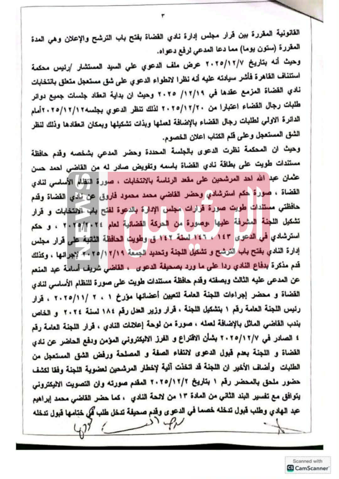 وكشفت أوراق الدعوى، وفق ما اطمأنت إليه المحكمة، أن مجلس إدارة نادي القضاة قرر في جلسته المنعقدة بتاريخ 29 أكتوبر 2025 دعوة الجمعية العمومية للانتخاب، وفتح باب الترشح، "دون أن يسمي أعضاء اللجنة المشرفة أو يفوض أحدًا صراحة في تشكيلها".