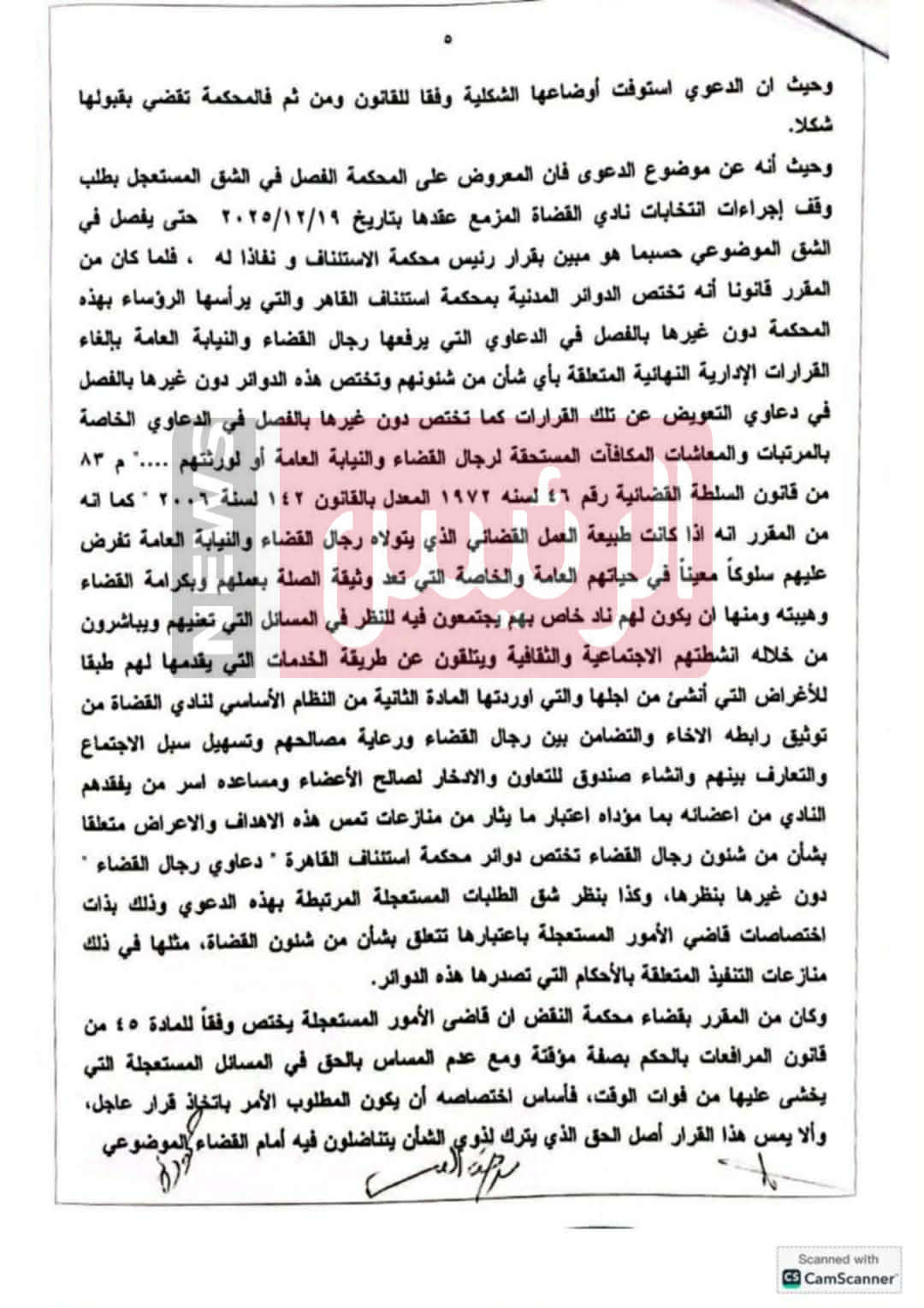 وانتهت المحكمة إلى الحكم بـ: قبول الدعوى والتدخل شكلًا، ووقف كافة إجراءات انتخابات نادي قضاة مصر المقرر إجراؤها في 19 ديسمبر 2025 بصفة مستعجلة، وتنفيذ الحكم بمسودته دون إعلان، وعرض الأوراق على رئيس محكمة استئناف القاهرة لتحديد جلسة لنظر الموضوع أمام الدائرة المختصة.