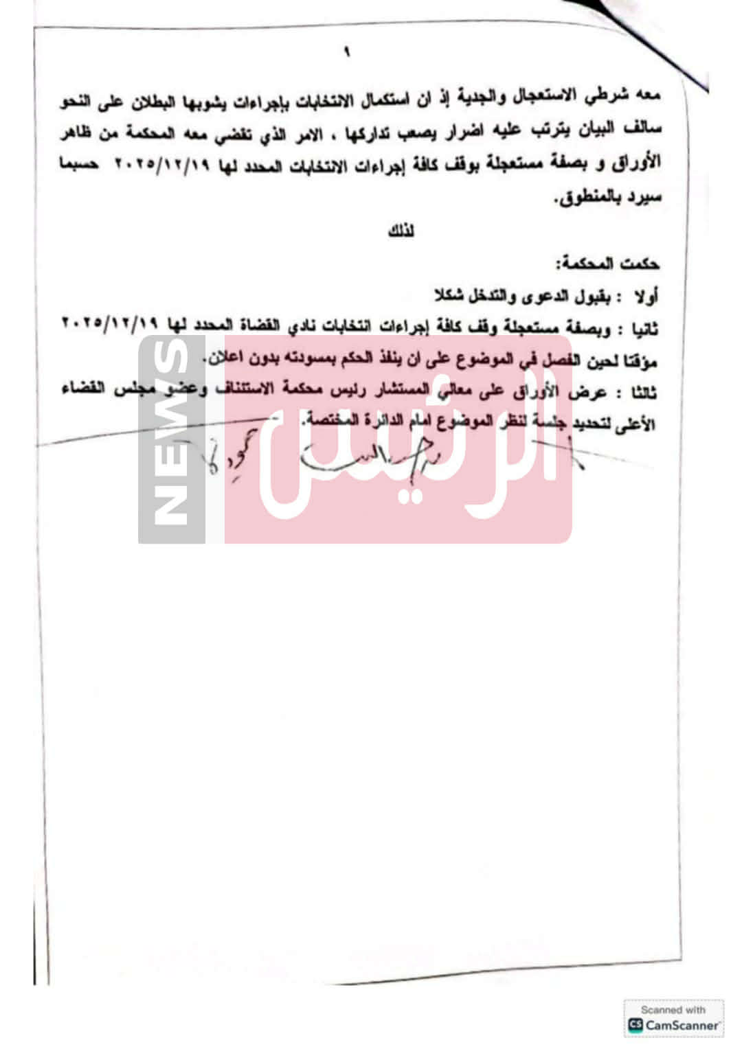 وانتهت المحكمة – من ظاهر المستندات – إلى أن قرار تشكيل اللجنة العامة المشرفة على الانتخابات يشوبه البطلان ومخالفة اللائحة، سواء من حيث جهة الاختصاص، أو من حيث تجاوز الأقدمية، أو من حيث غياب التفويض الصحيح.