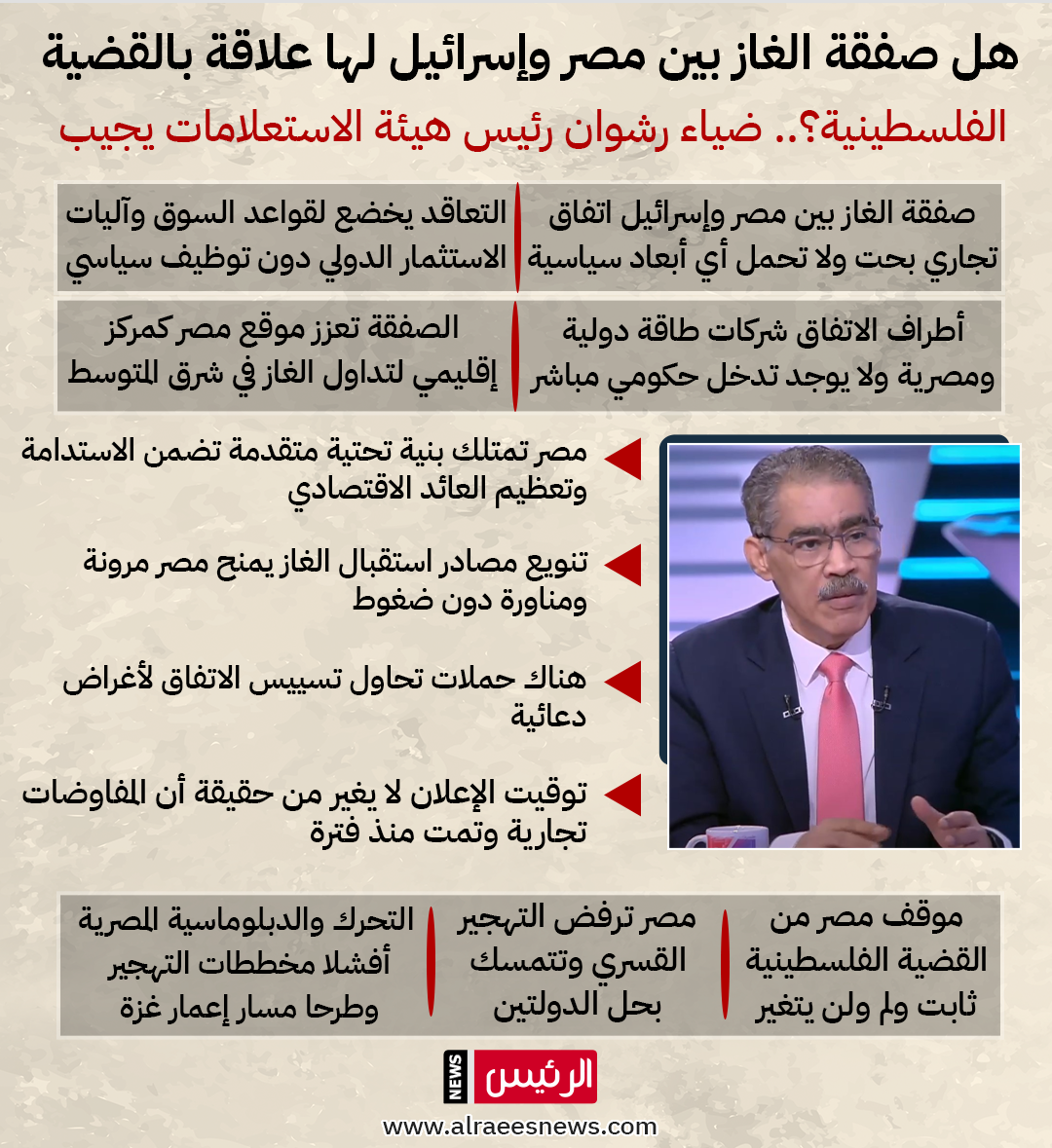 ضياء رشوان: صفقة الغاز اتفاق تجاري بحت ولا تحمل أي تفاهمات سياسية| إنفوجراف