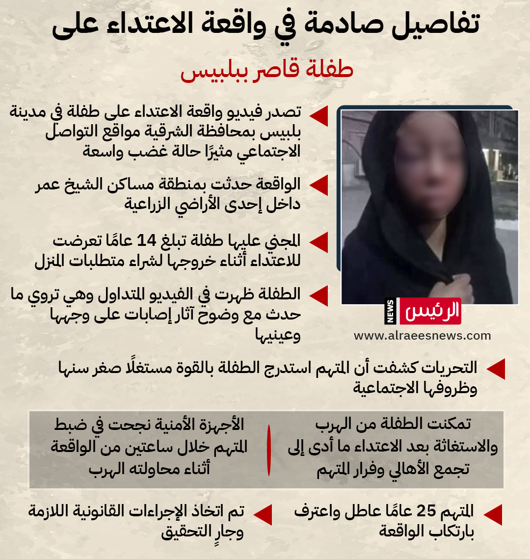 تفاصيل صادمة في واقعة الاعتداء على طفلة قاصر ببلبيس