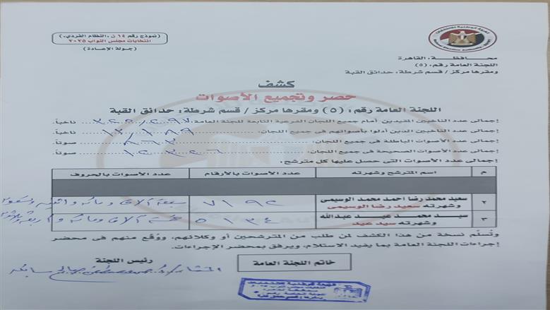 وأعلن المستشار أحمد سابق، رئيس اللجنة العامة الخامسة ومقرها مركز شباب حدائق القبة، النتيجة النهائية لجولة الإعادة في انتخابات مجلس النواب، وذلك بحضور المستشار صالح إبراهيم والمستشار شريف علي جمال الدين، بعد الانتهاء من أعمال الفرز والمراجعة.