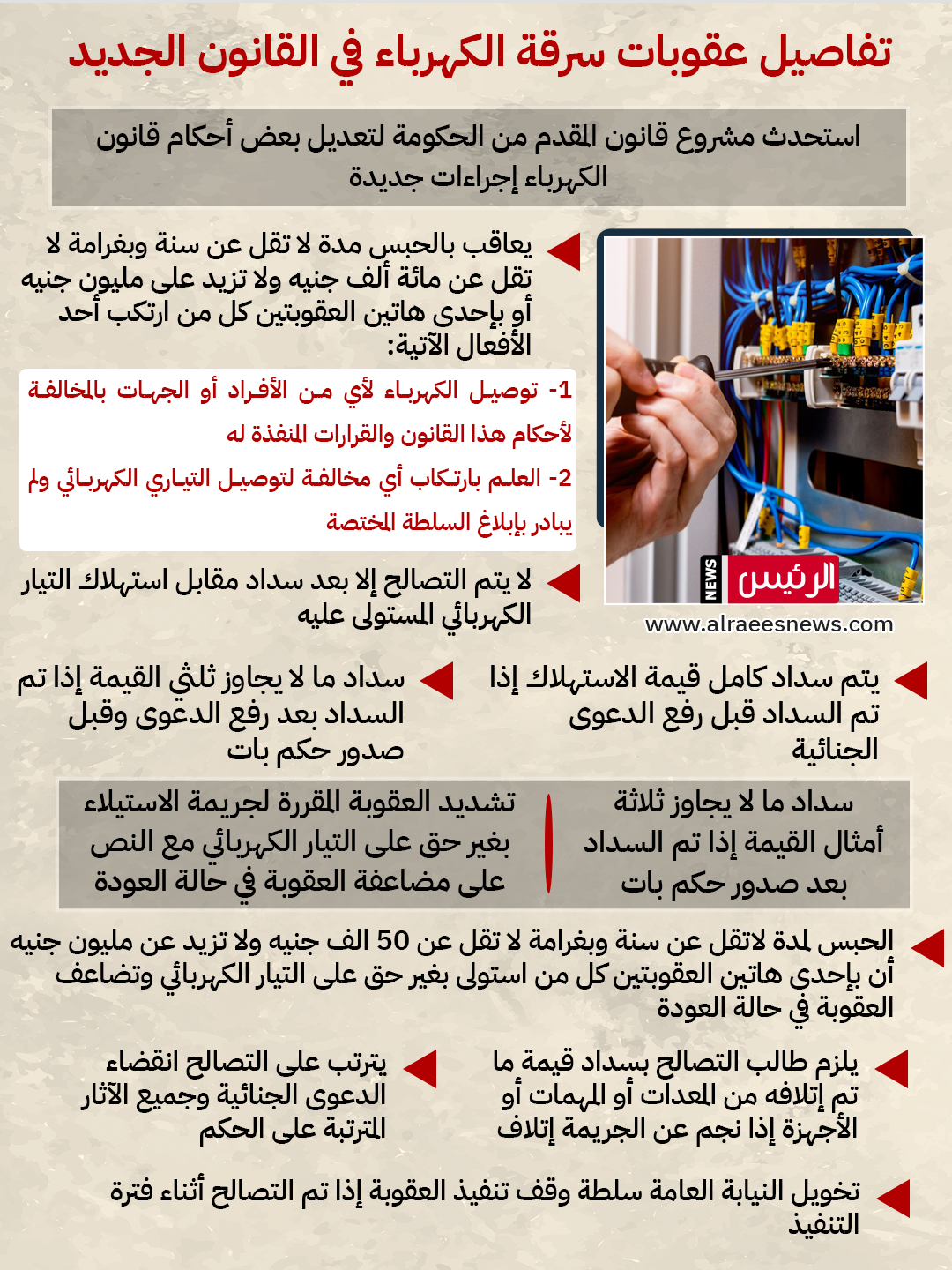 بعد موافقة "الشيوخ" وإحالته لـ"النواب".. تفاصيل عقوبات سرقة الكهرباء في القانون الجديد (إنفوجراف)| عاجل