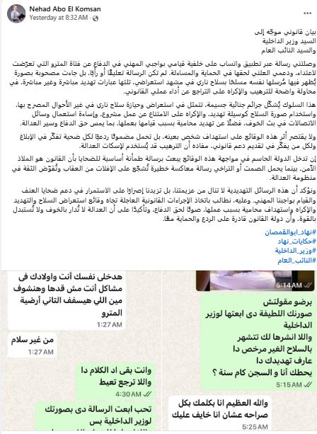 وصلتني رسالة عبر تطبيق واتساب على خلفية قيامي بواجبي المهني في الدفاع عن فتاة المترو التي تعرّضت لاعتداء، ودعمي العلني لحقها في الحماية والمساءلة. لم تكن الرسالة تعليقًا أو رأيًا، بل جاءت مصحوبة بصورة يُظهر فيها مُرسلها نفسه مسلحًا بسلاح ناري في مشهد استعراضي، تلتها عبارات تهديد مباشرة وغير مباشرة، في محاولة واضحة للترهيب والإكراه على التراجع عن أداء عملي القانوني.