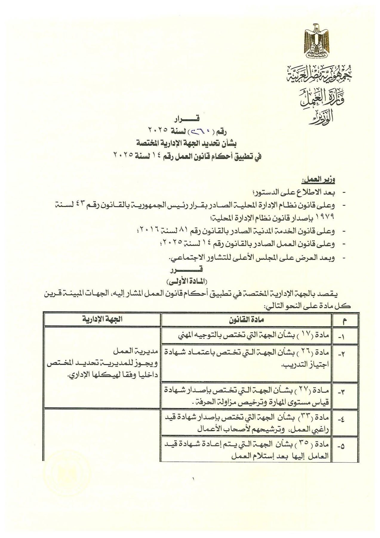 وأصدر وزير العمل قرارًا وزاريًا رقم (260) لسنة 2025، بشأن تحديد الجهة الإدارية المختصة بتطبيق أحكام قانون العمل رقم 14 لسنة 2025، وذلك بعد الاطلاع على الدستور، وعلى قانون نظام الإدارة المحلية الصادر بالقانون رقم 43 لسنة 1979، وعلى قانون الخدمة المدنية الصادر بالقانون رقم 81 لسنة 2016، وعلى قانون العمل الصادر بالقانون رقم 14 لسنة 2025، وبعد العرض على المجلس الأعلى للتشاور الاجتماعي.
