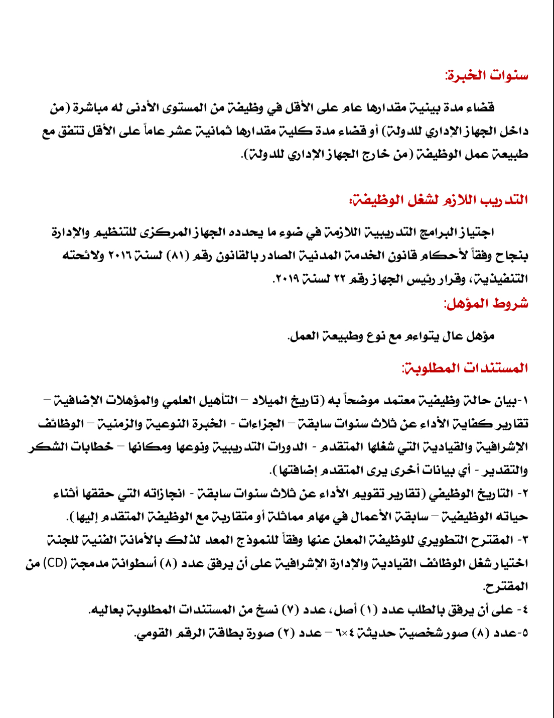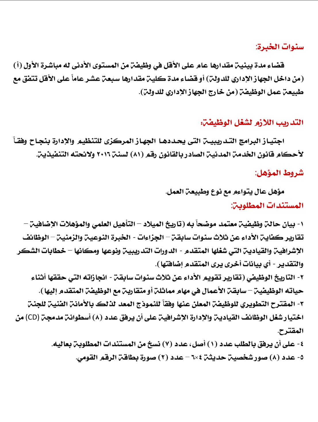 1- بيان حالة وظيفية معتمد موضحًا به (تاريخ الميلاد – التأهيل العلمي والمؤهلات الإضافية – تقارير كفاية الأداء عن ثلاث سنوات سابقة – الجزاءات – الخبرة النوعية والزمنية – الوظائف الإشرافية والقيادية التي شغلها المتقدم – الدورات التدريبية ونوعها ومكانها – خطابات الشكر والتقدير – أي بيانات أخرى يرى المتقدم إضافتها).