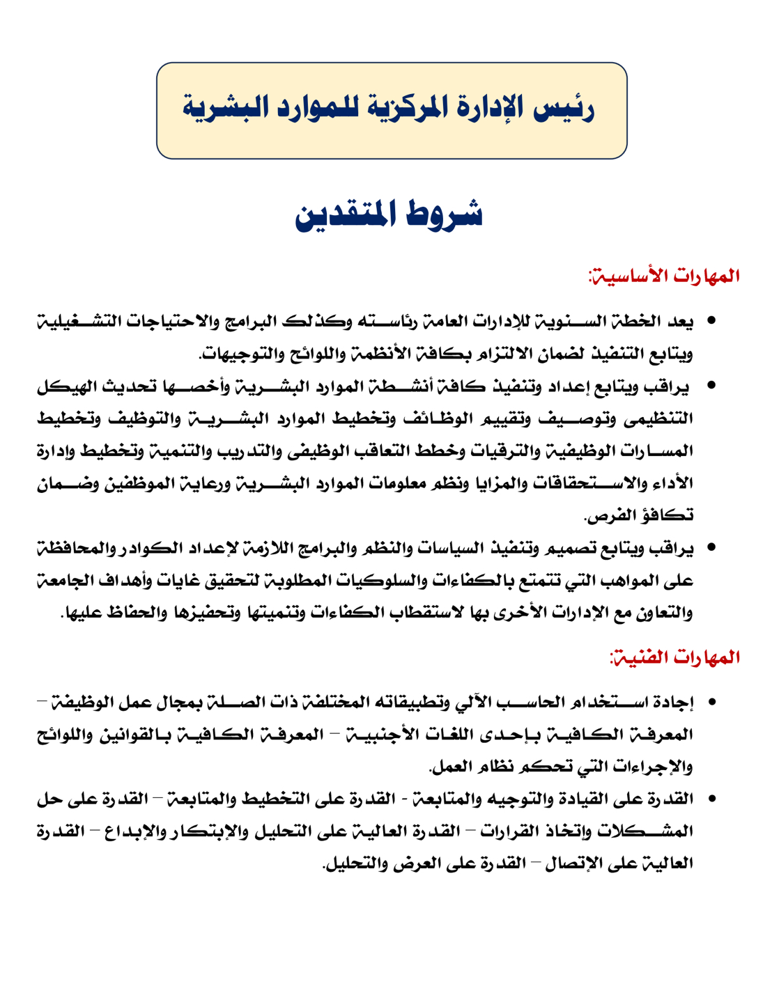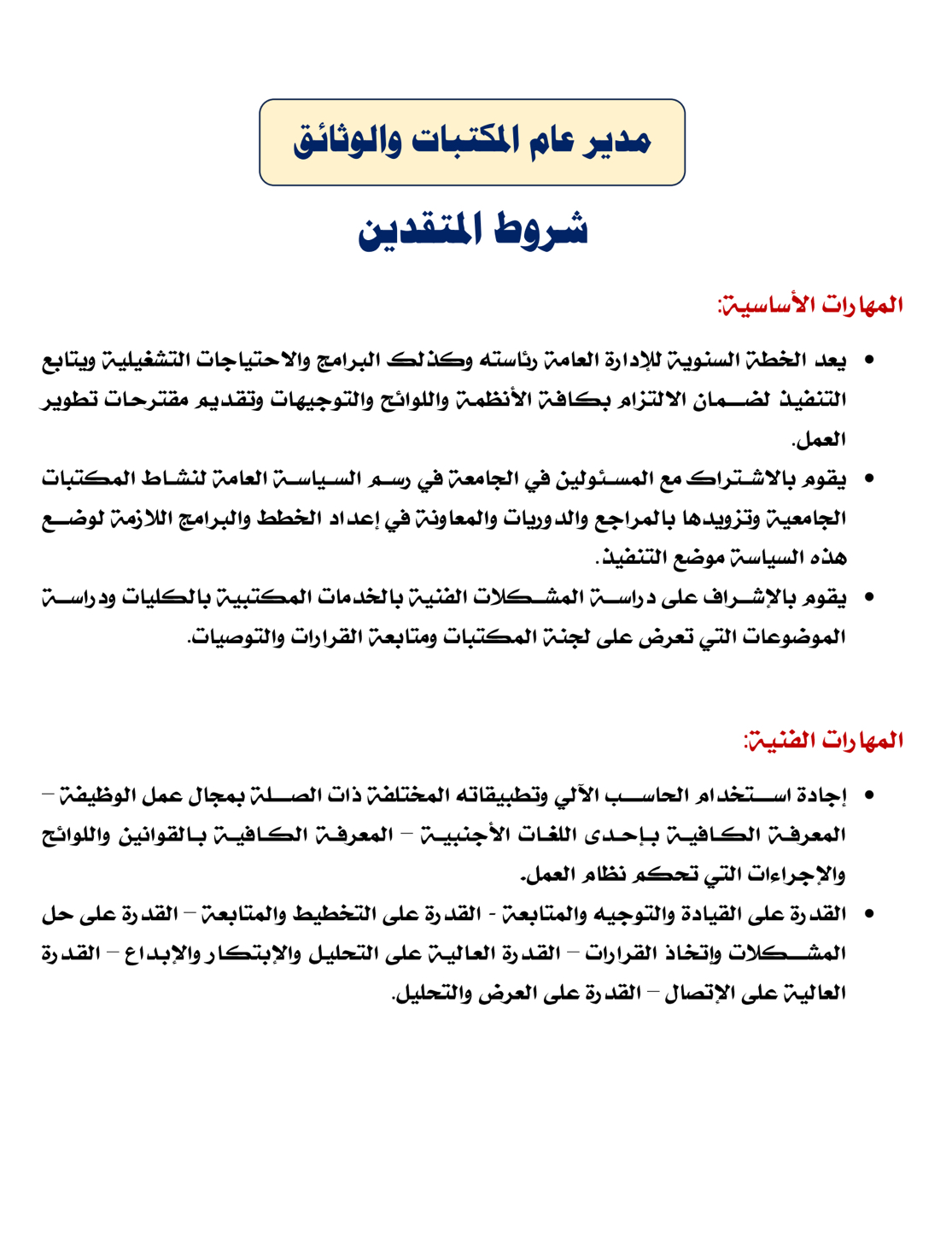 • إجادة استخدام الحاسب الآلي وتطبيقاته المختلفة ذات الصلة بمجال عمل الوظيفة – المعرفة الكافية بإحدى اللغات الأجنبية – المعرفة الكافية بالقوانين واللوائح والإجراءات التي تحكم نظام العمل.