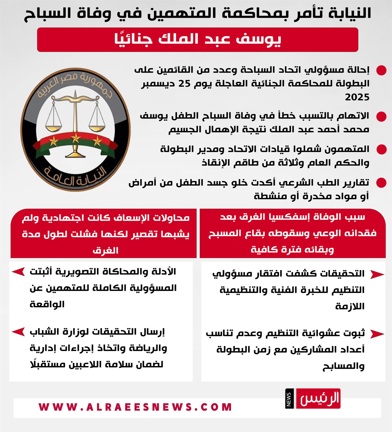 أمرت النيابة العامة بتقديم المتهمين بالتسبب في وفاة السباح يوسف محمد أحمد عبد الملك، للمحاكمة الجنائية العاجلة يوم الخميس الموافق ٢٥ ديسمبر ٢٠٢٥.