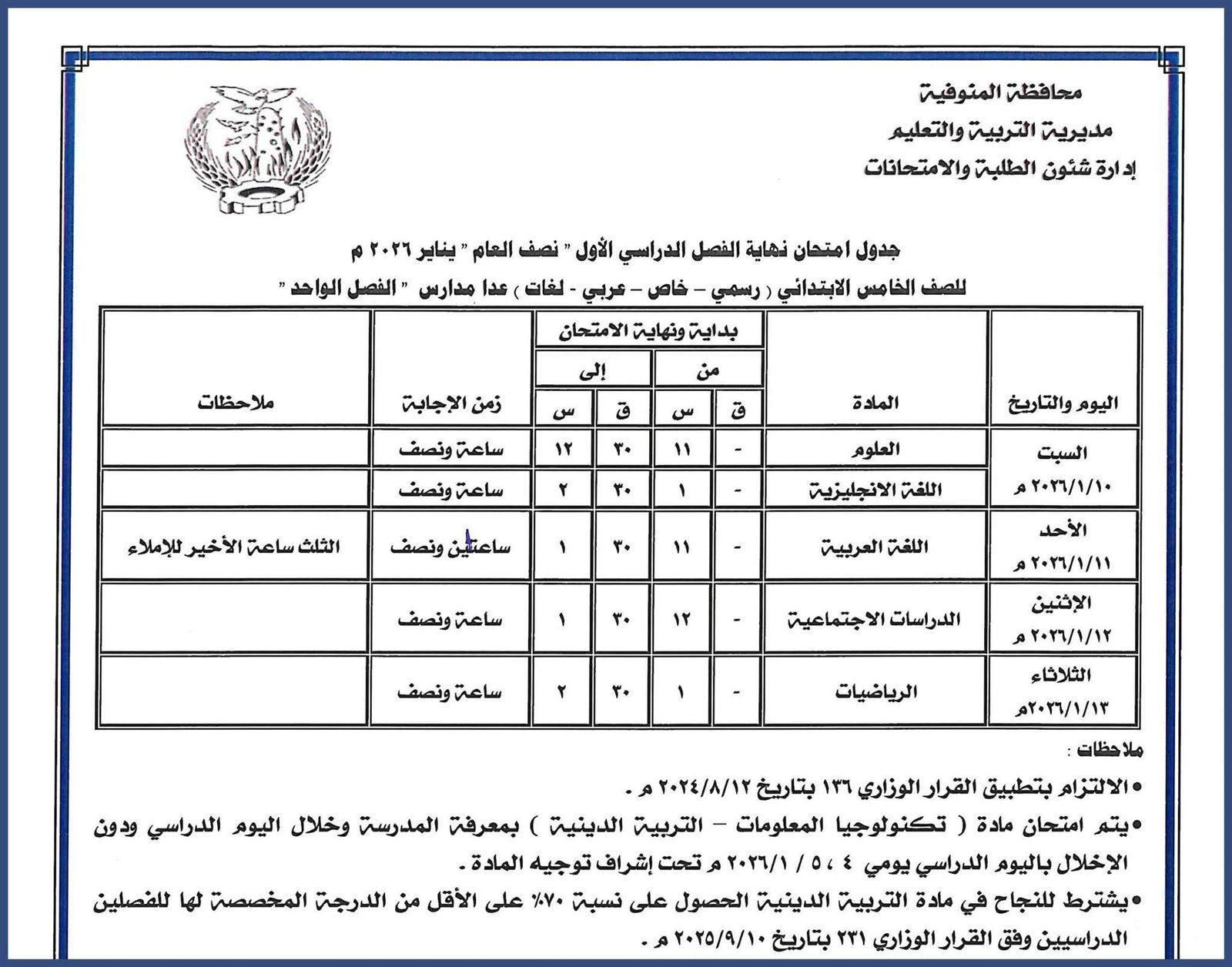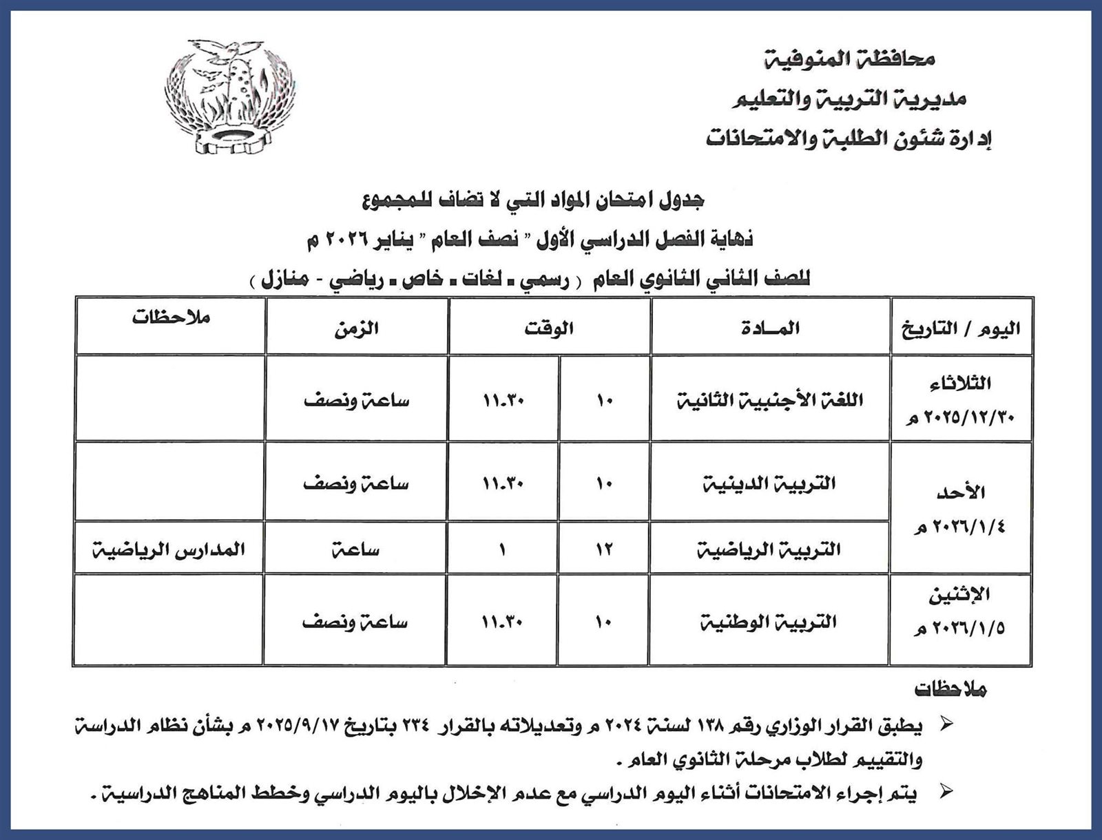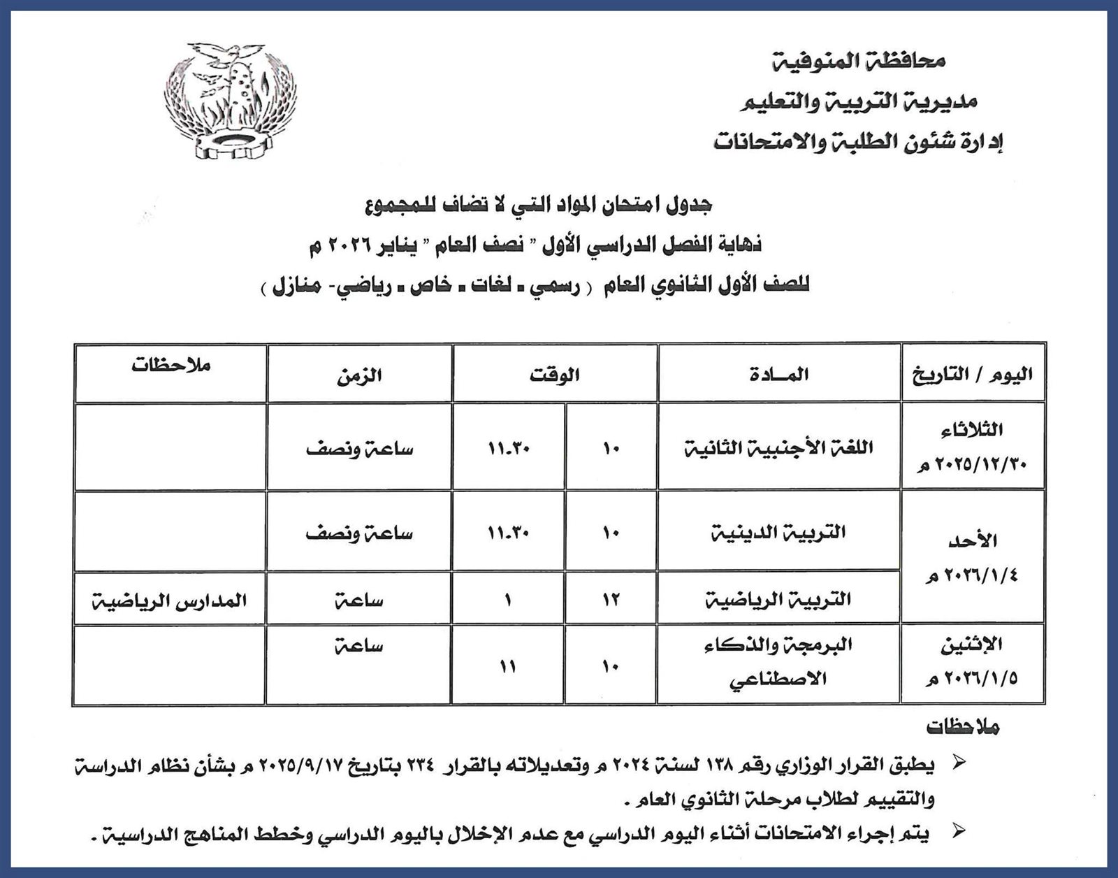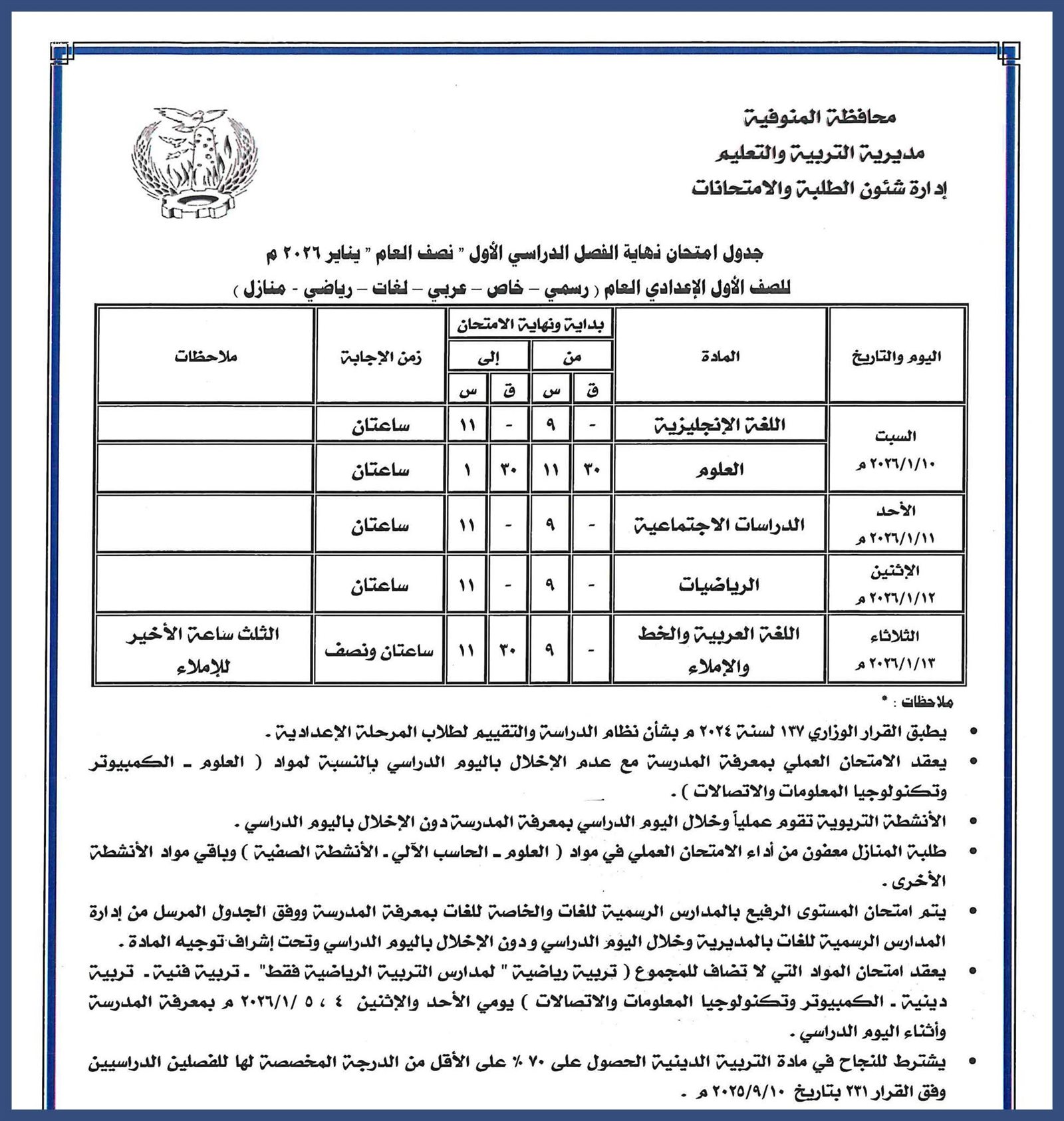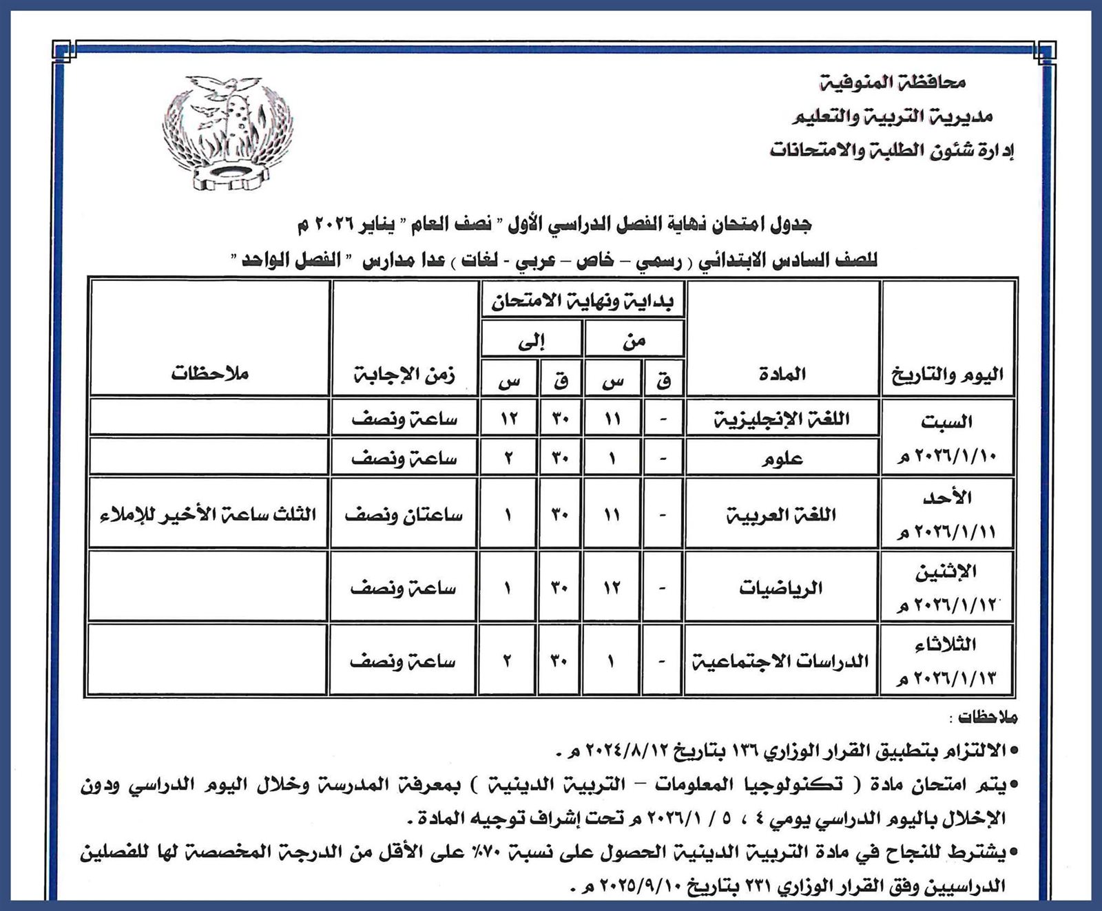 ويمكن الحصول على جداول امتحانات الترم الأول 2026 لجميع الصفوف بالمنوفية، من خلال مطالعة الصور التالية: