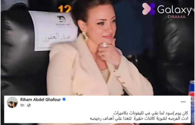 وجاء على حساب الفنانة ريهام عبد الغفور الشخصي: كان يوم إسود لما بقي في تليفونات بكاميرات «أدت الفرصة لشوية كائنات حقيرة تتغذا علي أهداف رخيصة».