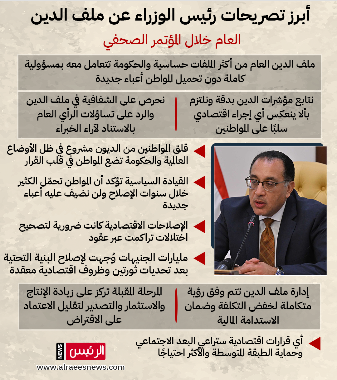 وأشار رئيس الوزراء، خلال مؤتمر صحفي نقلته قناة إكسترا نيوز، إلى أن قضية الدين طُرحت في العديد من البرامج والحوارات الإعلامية، لافتًا إلى أنه حرص على الرد باستفاضة على هذه التساؤلات، مستندًا في ذلك إلى آراء خبراء الاقتصاد وتقارير المؤسسات المتخصصة، مبينًا أن الحكومة تدرك حساسية الملف لدى الرأي العام، لذلك تتبنى نهج الشفافية في عرض الحقائق وتوضيح خلفيات القرارات الاقتصادية للمواطنين.