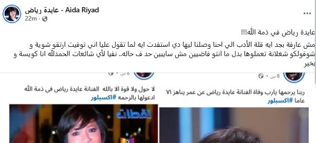 عبرت عايدة رياض عن استيائها الشديد من هذه الشائعة، مؤكدة أنها عارية تمامًا من الصحة، حيث نشرت عبر حسابها الرسمي نماذج من الصفحات التي روجت للخبر، وعلقت قائلة: "مش عارفة بجد إيه قلة الأدب اللي إحنا وصلنا ليها دي.. استفدت إيه لما تقول عليّ إني توفيت؟ ارتقوا شوية، وشوفوا لكم شغلانة تعملوها بدل ما انتوا فاضيين ومش سايبين حد في حاله".واختتمت حديثها مطمئنة جمهورها، نفيًا لأي شائعات: "الحمد لله انا كويسة وبخير".