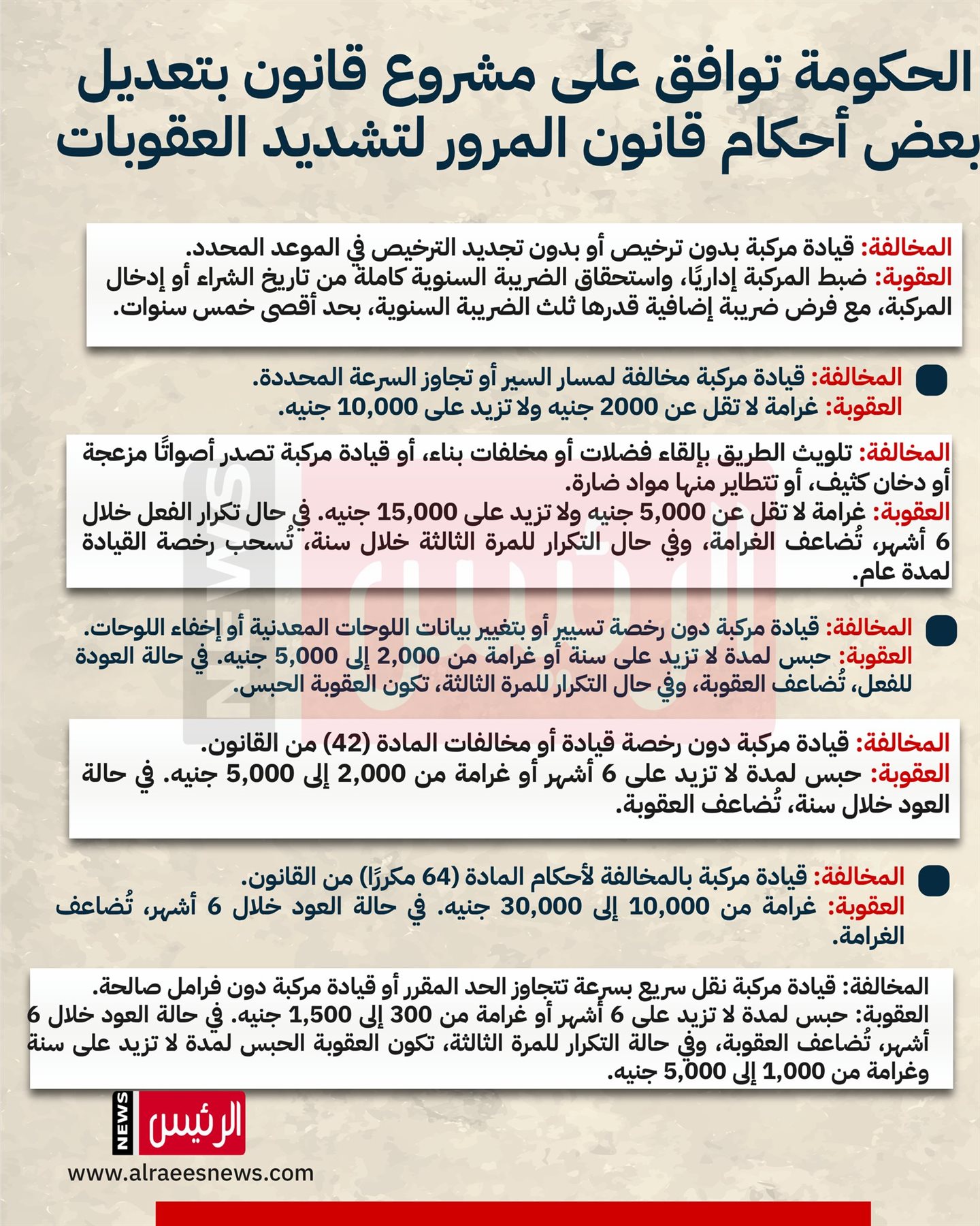 “الرئيس نيوز” يستعرض في الإنفوجراف التالي تفاصيل العقوبات الجديدة في قانون المرور وفق تعديل بعض أحكامه.
