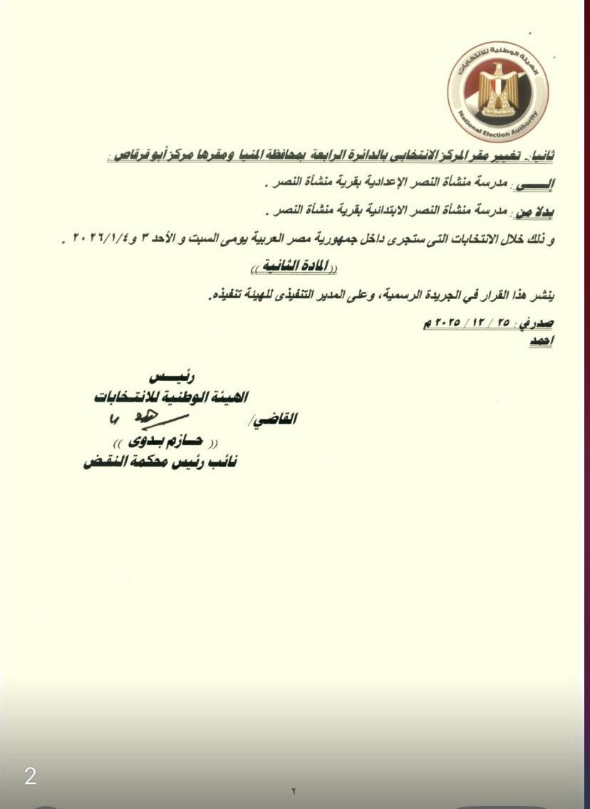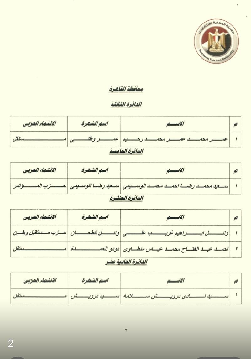 أعلنت الهيئة الوطنية للانتخابات، برئاسة القاضي حازم بدوى، نتيجة جولة الإعادة بالمرحلة الثانية من انتخابات مجلس النواب، وجاءت نتيجة المحافظات كالتالي: