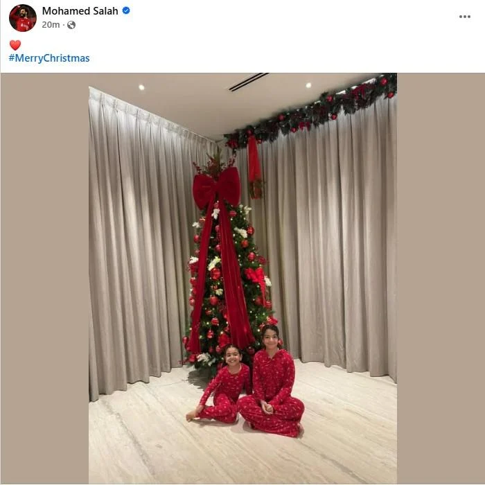 وشارك صلاح متابعيه عبر حسابه الرسمي على منصة «إكس» صورة تجمع ابنتيه مكة وكيان، وهما ترتديان أزياء احتفالية خاصة بالكريسماس، وخلفهما شجرة عيد الميلاد، مرفقًا الصورة بتعليق: "Merry Christmas".