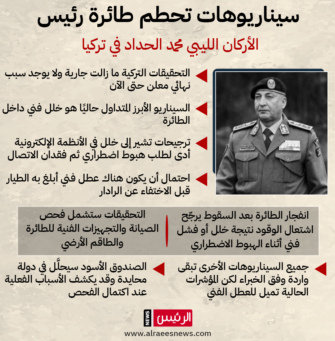 لا تزال التحقيقات التركية بشأن حادث تحطم الطائرة الذي أودى بحياة رئيس الأركان الليبي محمد الحداد ومرافقيه قرب العاصمة أنقرة، مستمرا وسط حديث خبراء ومسؤولين سابقين عن سيناريوهات متعددة لأسباب الحادث، مع ترجيح فرضية الخلل الفني في هذه المرحلة المبكرة.