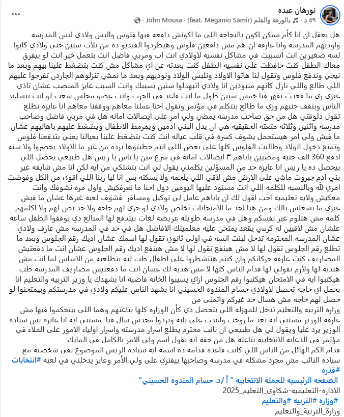 نشرت الإعلامية نورهان عبده استغاثة عبر صفحتها الرسمية على مواقع التواصل الاجتماعي، كشفت خلالها عن معاناتها المستمرة مع إحدى مدارس اللغات بمحافظة الجيزة، متهمة إدارة المدرسة بممارسات وصفتها بـ«المهينة نفسيًا» للأطفال وأولياء الأمور، مطالبة وزارة التربية والتعليم والتعليم الفني بالتدخل العاجل والتحقيق في الواقعة.