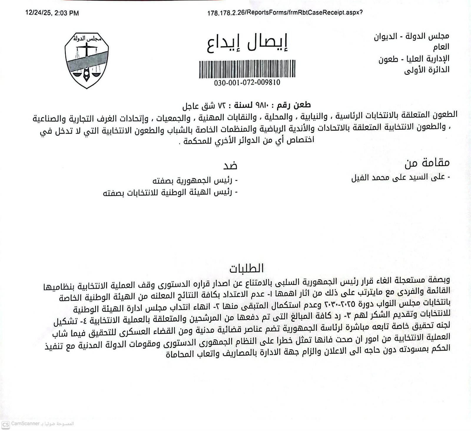 كما شملت الطلبات إلزام جهة الإدارة برد جميع المبالغ التي قام المرشحون بسدادها، والمتعلقة بالعملية الانتخابية، باعتبارها – بحسب الطعن – قد جرت في إطار يفتقد المشروعية الدستورية.