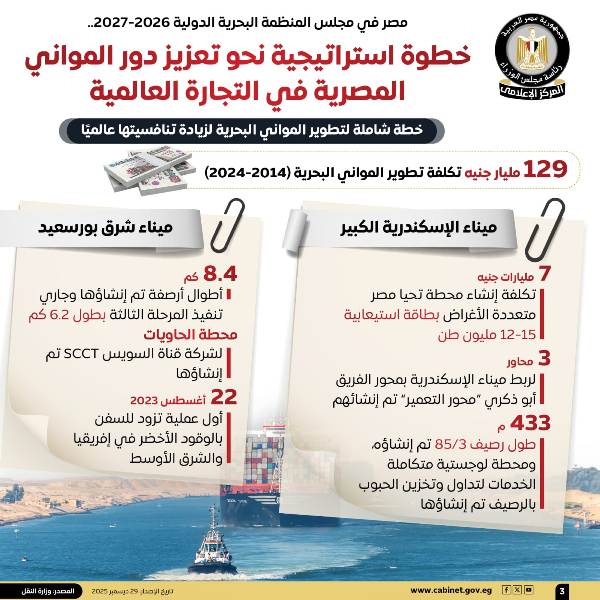 نشر المركز الإعلامي لمجلس الوزراء عددًا من الإنفوجرافات عبر منصاته على مواقع التواصل الاجتماعي، سلط من خلالها الضوء على فوز مصر بعضوية مجلس المنظمة البحرية الدولية 2026/2027، في خطوة استراتيجية نحو تعزيز دور المواني المصرية في التجارة العالمية.