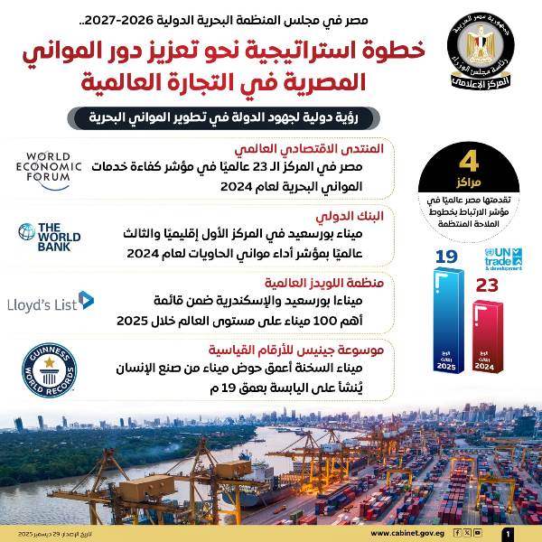 من جانبه، أشار البنك الدولي إلى تصدّر ميناء بورسعيد المركز الأول إقليميًا والثالث عالميًا بمؤشر أداء مواني الحاويات لعام 2024، كما أكدت منظمة اللويدز العالمية، أن ميناءي بورسعيد والإسكندرية، ضمن قائمة أهم 100 ميناء على مستوى العالم خلال 2025.