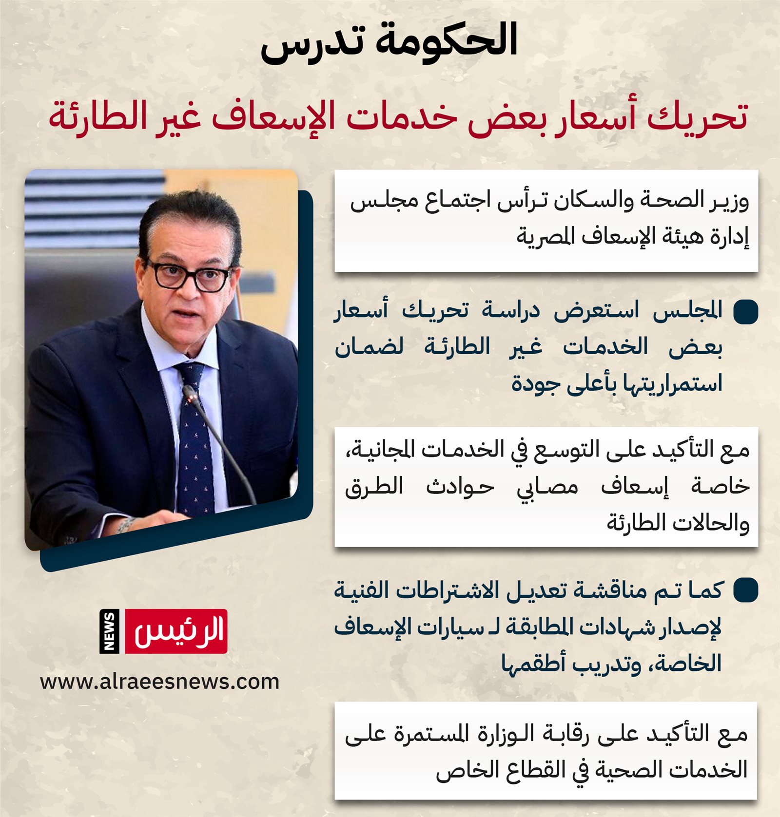 واستعرض المجلس دراسة تحريك أسعار بعض الخدمات غير الطارئة لضمان استمراريتها بأعلى جودة، مع التأكيد على التوسع في الخدمات المجانية، خاصة إسعاف مصابي حوادث الطرق والحالات الطارئة.