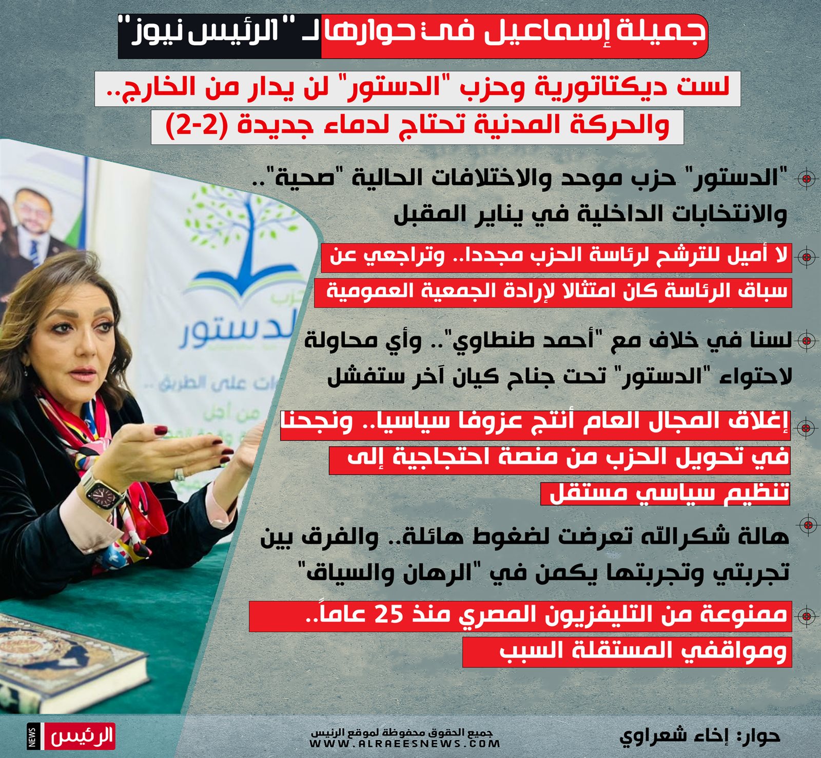 رئيسة حزب الدستور جميلة إسماعيل في حوارها لـ"الرئيس نيوز":