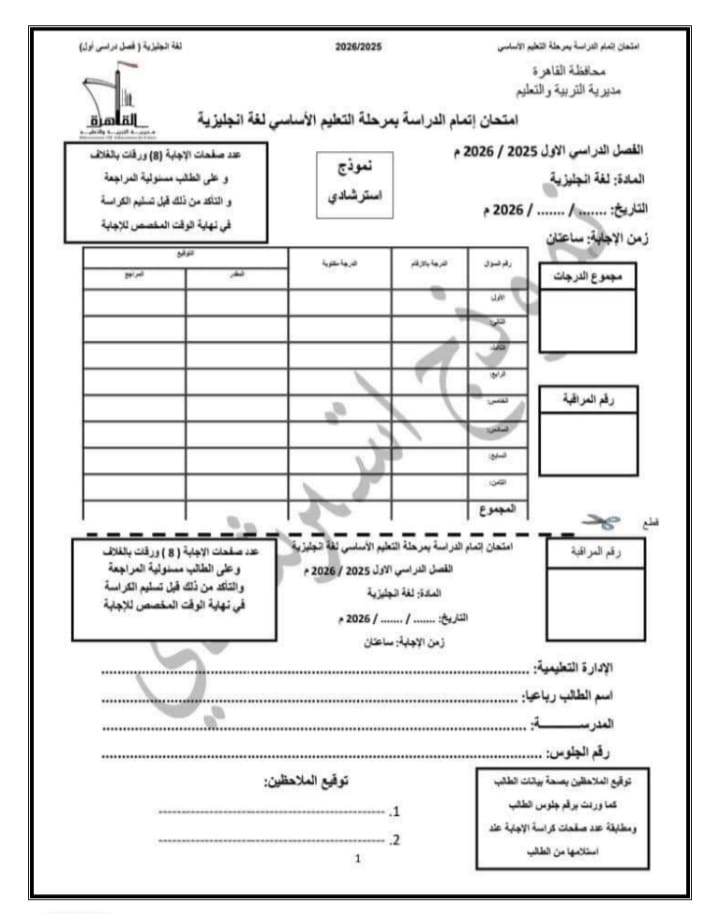 أتاحت مديرية التربية والتعليم بالقاهرة النماذج الاسترشادية بنظام البوكليت في مادة اللغة الإنجليزية لطلاب الشهادة الإعدادية للفصل الدراسي الأول للعام الدراسي 2025 / 2026.