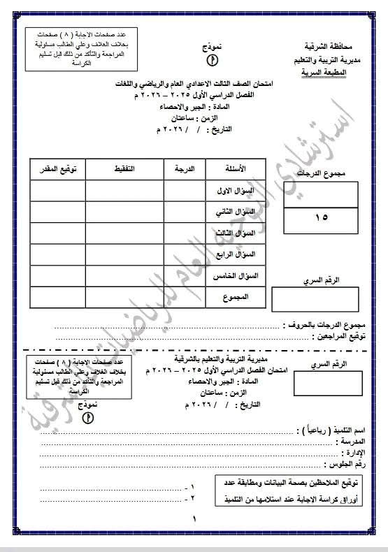 كما يمكن لطلاب الشهادة الإعدادية الحصول على نماذج امتحانات للصف الثالث الإعدادي ترم أول جبر 2026 من خلال مطالعة الصور التالية: