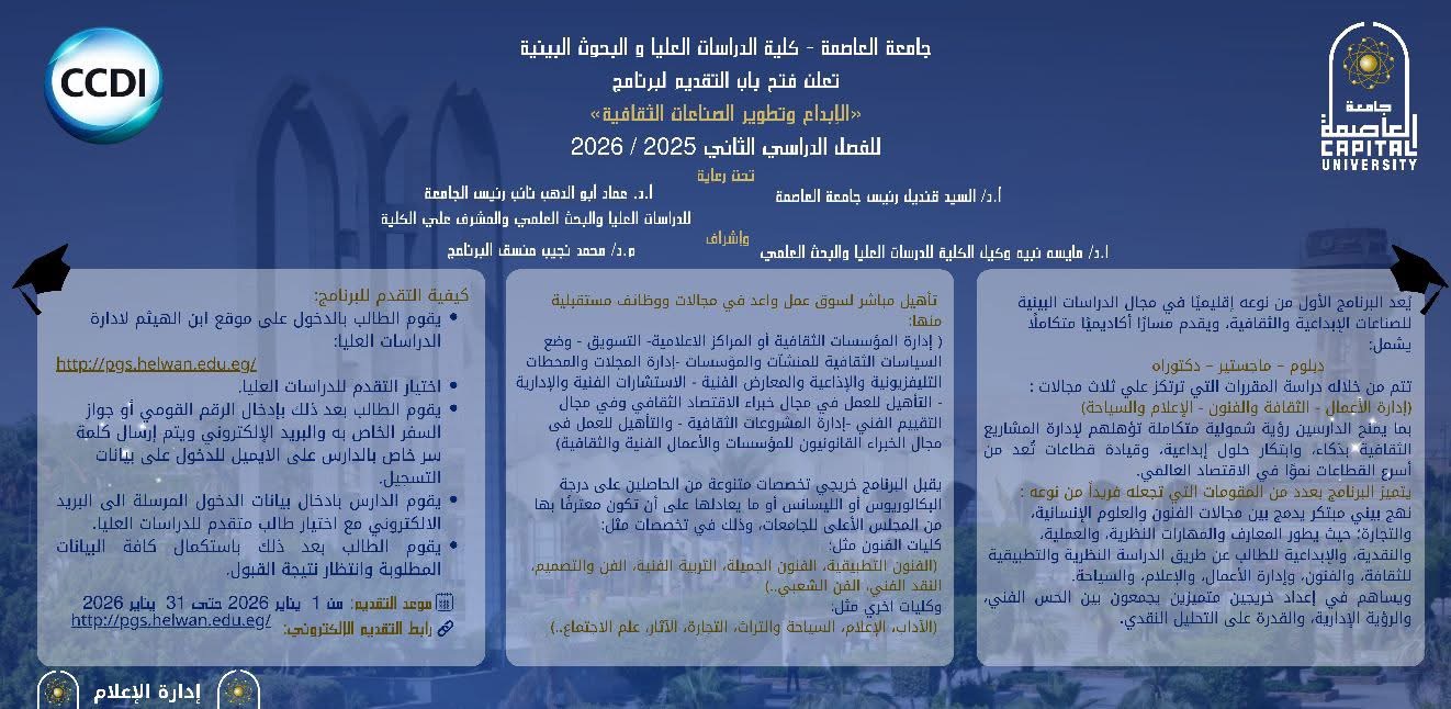 أعلنت كلية الدراسات العليا والبحوث البينية جامعة العاصمة (حلوان سابقًا) – أول كلية من نوعها في شمال إفريقيا والشرق الأوسط المتخصصة في الدراسات البينية – عن فتح باب التقديم لبرنامجها الرائد «الإبداع وتطوير الصناعات الثقافية» (CCDI)، وذلك للفصل الدراسي الثاني من العام الجامعي 2025 / 2026، وفي إطار دعم جامعة العاصمة (حلوان سابقًا) لمنظومة الدراسات العليا والبحث العلمي، وتعزيز دورها الريادي في تطوير البرامج الأكاديمية البينية المواكبة لمتطلبات المستقبل.