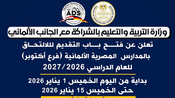 أعلنت وزارة التربية والتعليم والتعليم الفني، فتح باب التقديم للالتحاق بالمدرسة المصرية الألمانية – فرع مدينة أكتوبر، للعام الدراسي 2026 – 2027، للمرحلة الأولى من رياض الأطفال (KG1)، لمدة 15 يومًا تبدأ اعتبارًا من اليوم الخميس الموافق 1 يناير 2026 وحتى يوم الخميس الموافق 15 يناير 2026.
