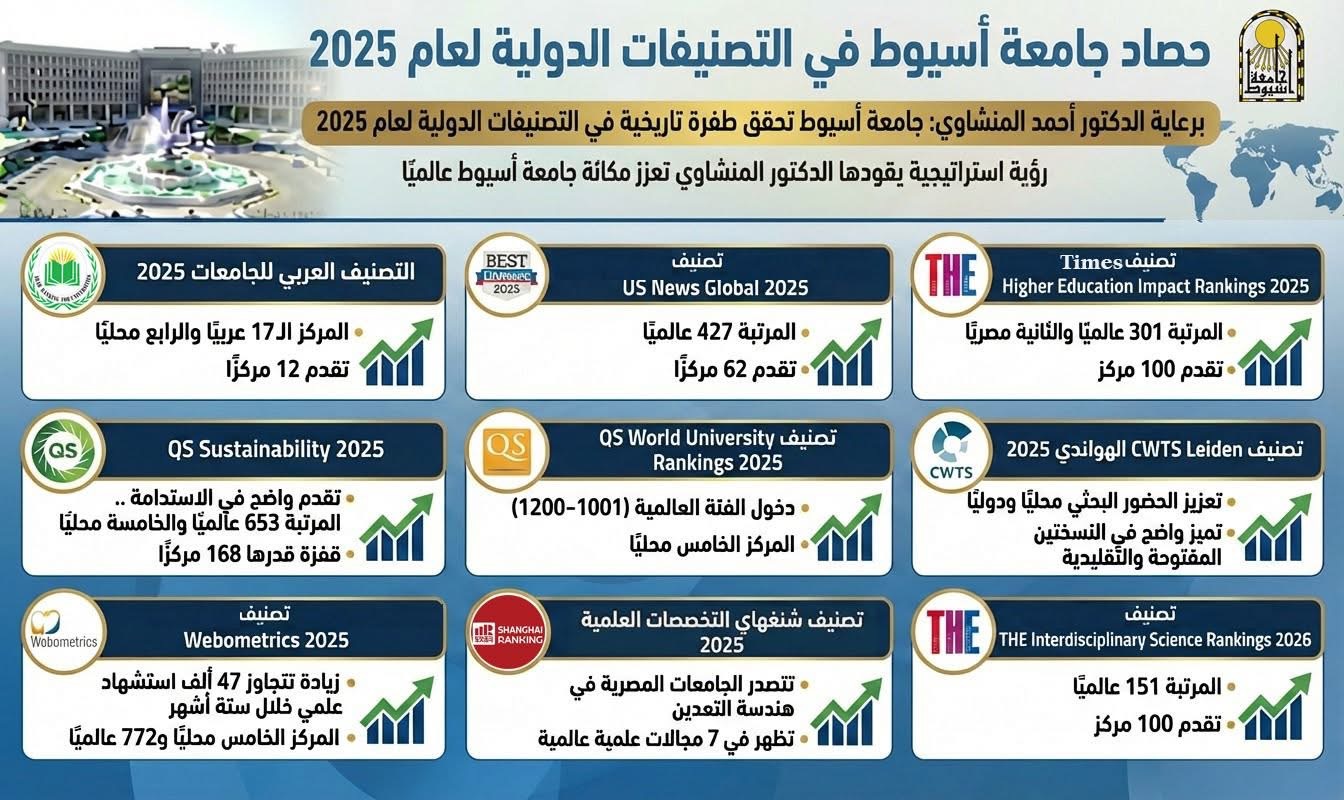 شهد عام 2025 مواصلة جامعة أسيوط ترسيخ مكانتها كواحدة من أبرز المؤسسات الأكاديمية إقليميًا ودوليًا، حيث حققت الجامعة طفرة نوعية في عدد من التصنيفات العالمية المرموقة، بما يعكس جودة منظومتها التعليمية وتنامي أثرها البحثي، ويؤكد نجاح استراتيجيتها المؤسسية الهادفة إلى دعم التميز الأكاديمي والبحث العلمي وخدمة المجتمع.