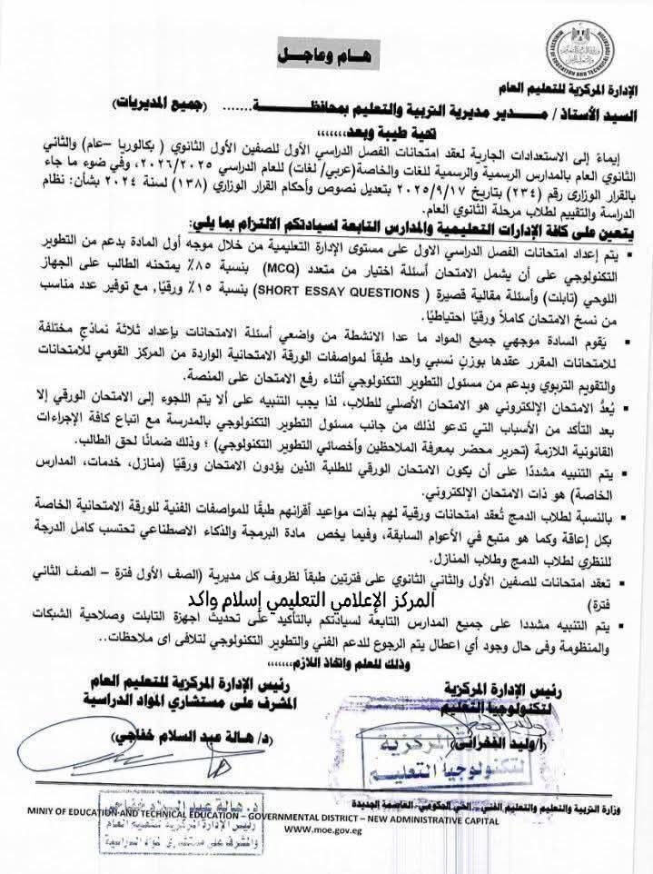 يأتي ذلك، في إطار الاستعدادات الجارية لعقد امتحانات الفصل الدراسي الأول للصفين الأول الثانوي (بكالوريا، عام) والثاني الثانوي العام بالمدارس الرسمية – الرسمية لغات – الخاصة (عربي / لغات)، وذلك في ضوء القرار الوزاري رقم (٢٣٤) بتاريخ ١٧ / ٩ / ٢٠٢٥ بتعديل نصوص وأحكام القرار الوزاري رقم (١٣٨) لسنة ٢٠٢٤ بشأن نظام الدراسة والتقييم لطلاب مرحلة الثانوي العام.