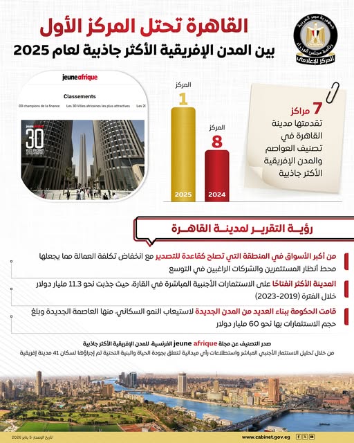 نشر المركز الإعلامي لمجلس الوزراء إنفوجرافًا عبر منصاته على مواقع التواصل الاجتماعي، سلط من خلاله الضوء على تصدر مدينة القاهرة قائمة المدن الإفريقية الأكثر جاذبية لعام 2025، وفقًا لتقرير مجلة "Jeune Afrique" الفرنسية.