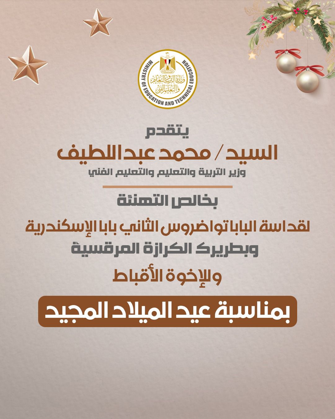 تقدم محمد عبد اللطيف، وزير التربية والتعليم والتعليم الفني، بخالص التهنئة إلى قداسة البابا تواضروس الثاني، بابا الإسكندرية وبطريرك الكرازة المرقسية، وإلى الإخوة الأقباط، بمناسبة عيد الميلاد المجيد.