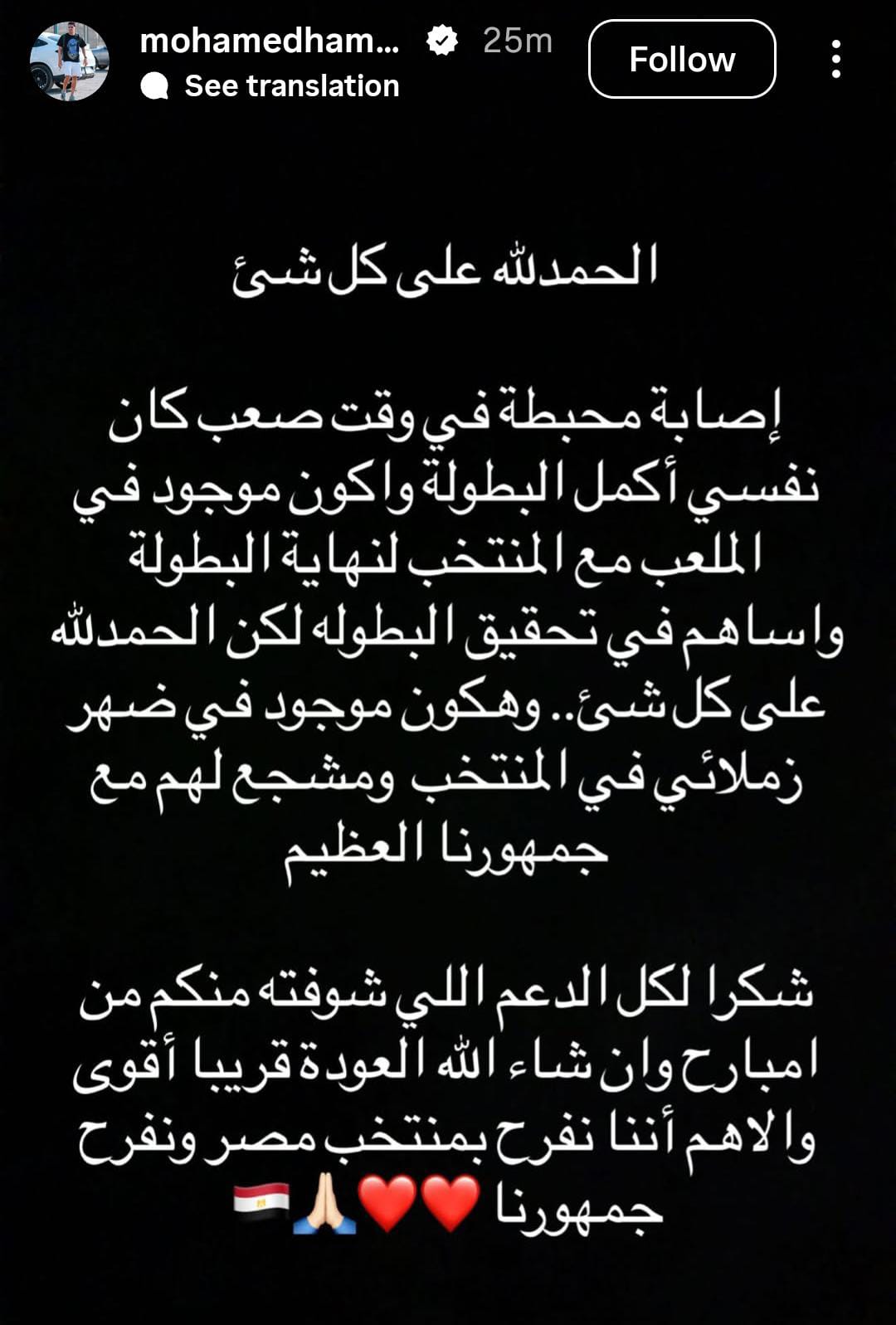 وقال محمد حمدي في رسالة عبر حسابه الرسمي على «إنستجرام»: «الحمد لله على كل حال، الإصابة جات في توقيت صعب جدًا، وكان نفسي أكمل المشوار مع المنتخب وأكون موجود في الملعب لحد آخر البطولة، لكن ده قدر ربنا».