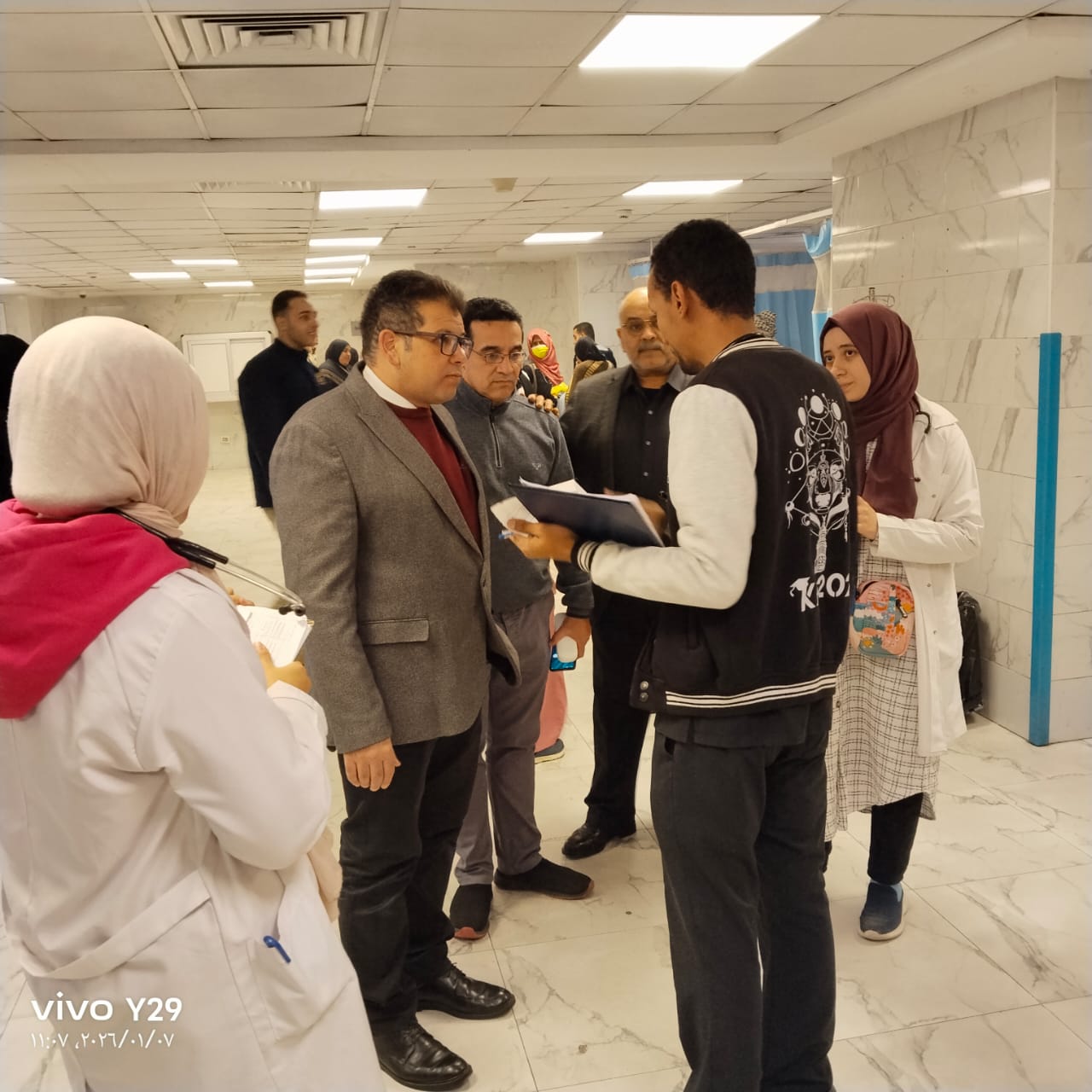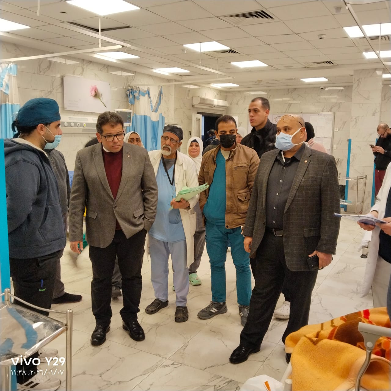 وفي هذا الإطار، قام الدكتور محمد عادل، نائب مدير مستشفى الطوارئ، بمتابعه من الدكتور أحمد ماهر مدير مستشفى الطوارئ بعمل جولة تفقدية شملت متابعة سير العمل والاطمئنان على حالات المرضى والمترددين، ومراجعة جاهزية الأقسام المختلفة وانتظام الفرق الطبية، بما يضمن استمرار تقديم الخدمة الطبية بكفاءة عالية خلال فترات الإجازات.