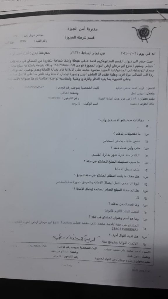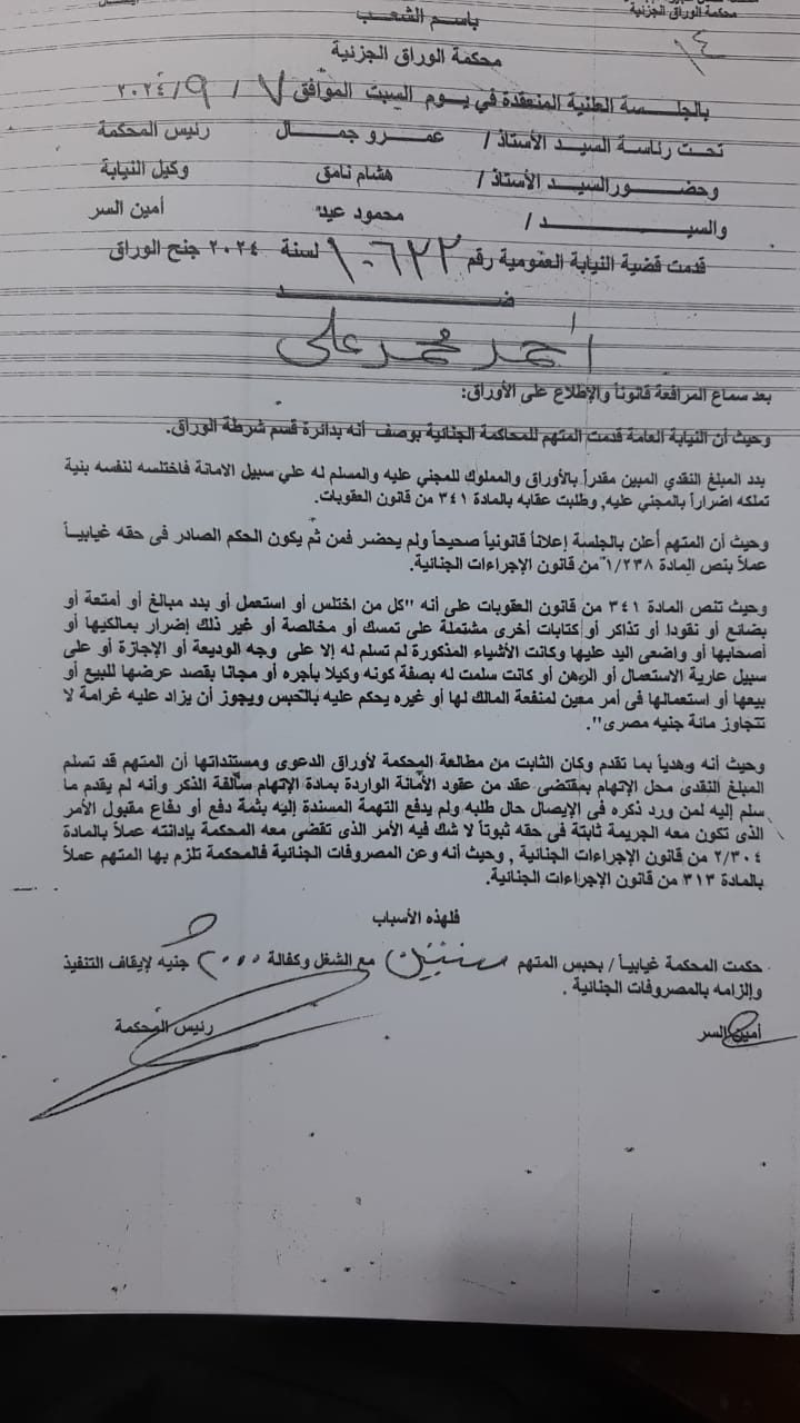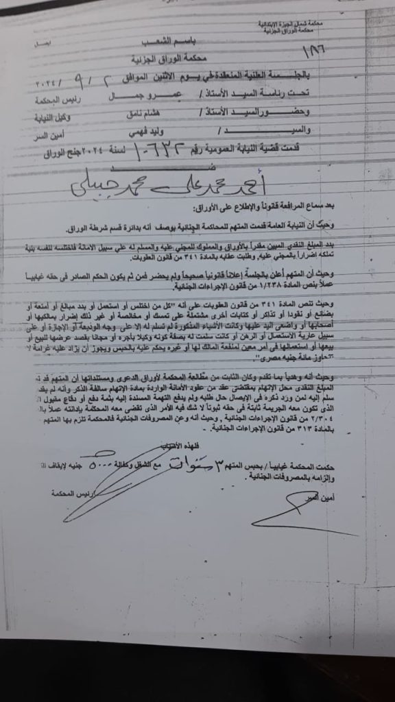 والقضية رقم 10632 لسنة 2024 جنح الوراق - وصادر ضده حكم بالحبس 3 سنوات.