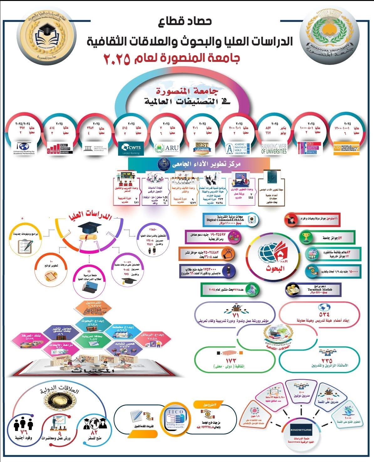 واصلت جامعة المنصورة، خلال عام 2025، ترسيخ مكانتها العلمية والبحثية والدولية في إطار رؤيتها الاستراتيجية المتوافقة مع «رؤية مصر 2030»، حيث شهد قطاع الدراسات العليا والبحوث والعلاقات الثقافية طفرة نوعية على مستوى التصنيفات العالمية، والبحث العلمي، وبناء القدرات، والتدويل المؤسسي.