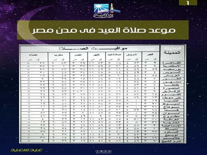 وأوضحت الدار في بيان، عبر صفحتها على "فيسبوك"، الاثنين، أن صلاة العيد في القاهرة، تحين في الخامسة و18 دقيقة.