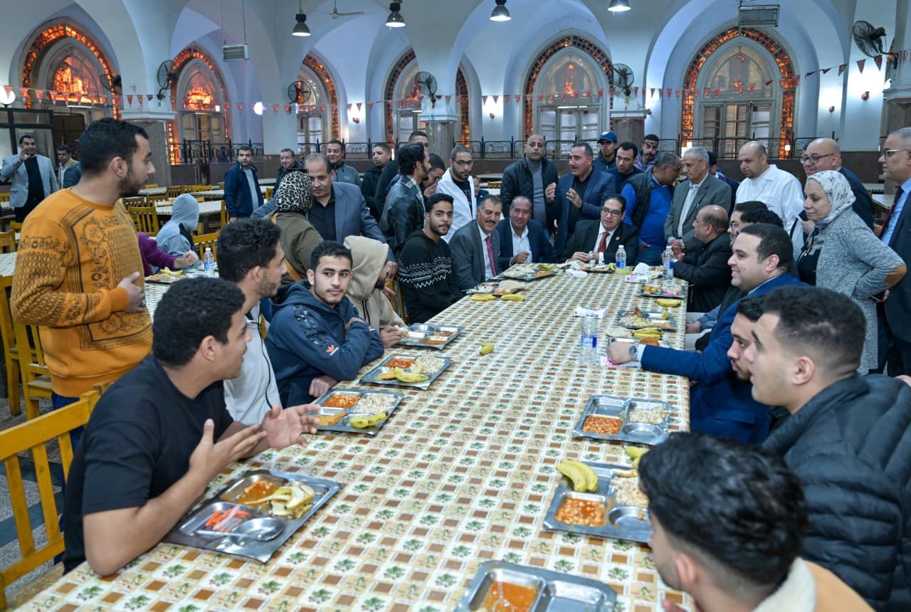 رئيس جامعة القاهرة يجرى حوارا مع الطلاب أثناء تناوله وجبة الغداء معهم ويستمع إلى ملاحظاتهم حول مستوى الخدمات المقدمة لهم ويوجه بسرعة التعامل معها ووضع حلول جذرية لأية مشكلة تواجههم
