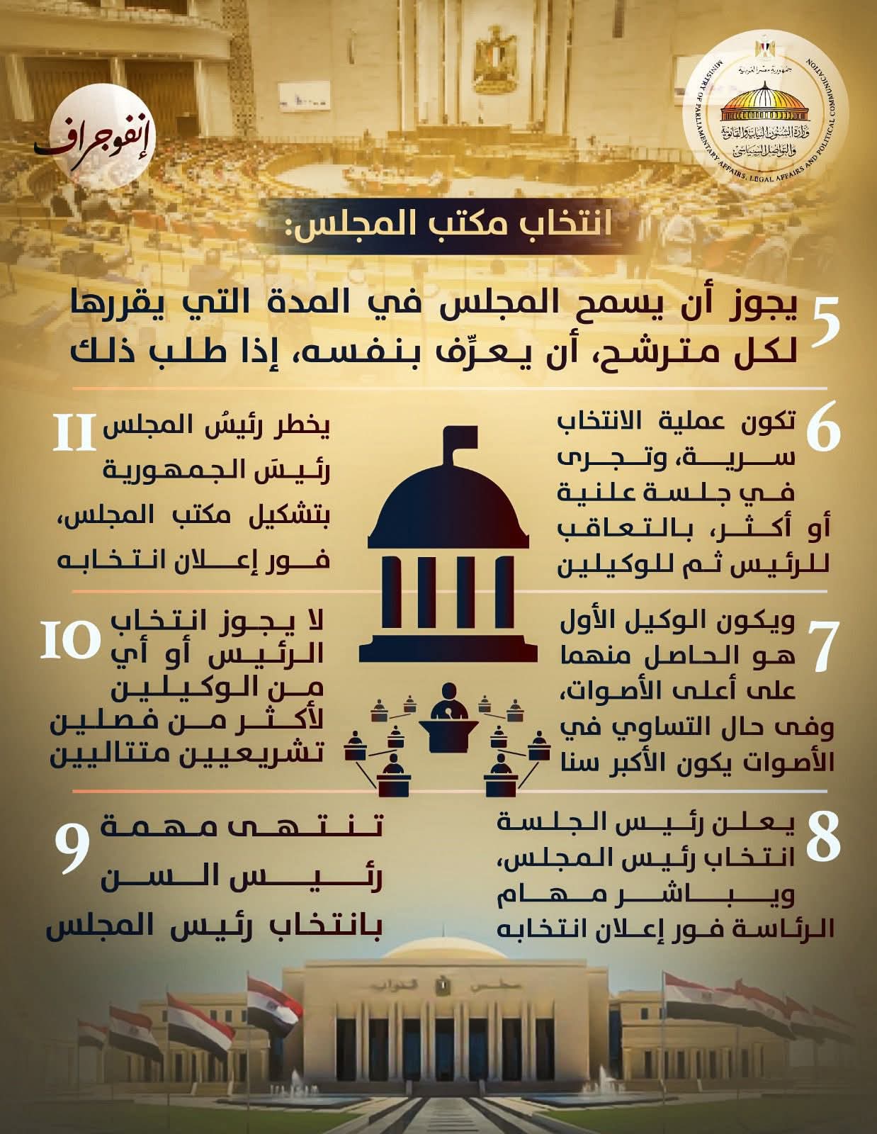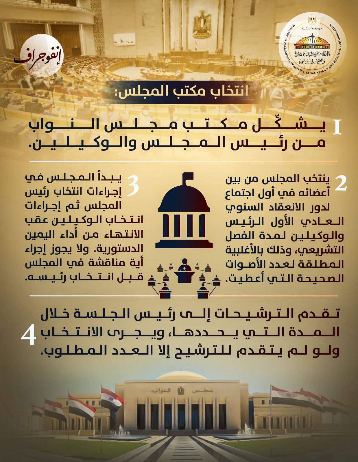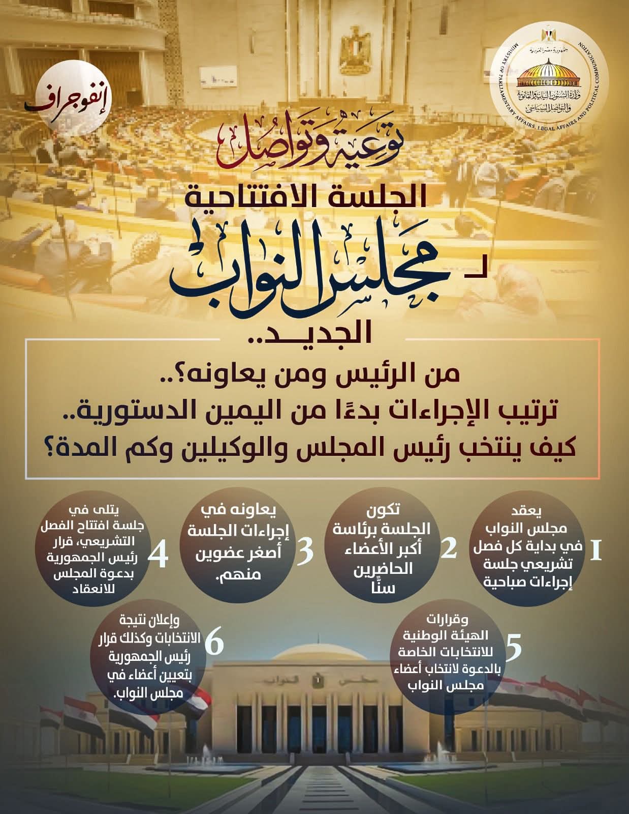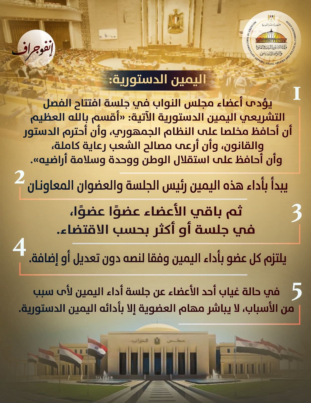 وتحت عنوان توعية وتواصل “كل ما يخص الجلسة الافتتاحية لمجلس النواب الجديد.. من الرئيس ومن يعاونه؟.. ترتيب الإجراءات بدءًا من اليمين الدستورية.. كيف ينتخب رئيس المجلس والوكيلين وكم المدة؟”.. أصدرت وزارة الشؤون النيابية إنفوجرافات جديدة، لتستكمل نشر المحتوى التوعوي.