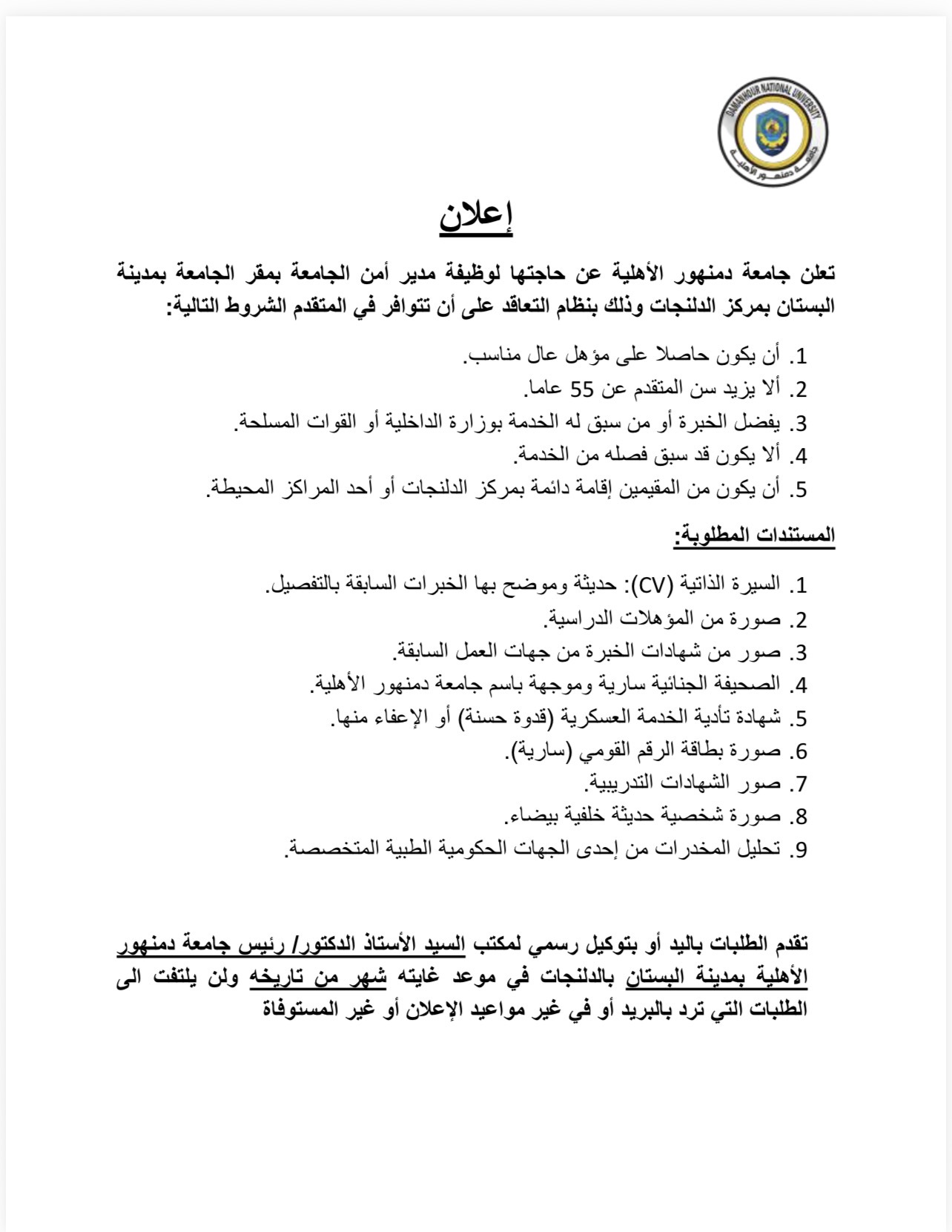أعلنت جامعة دمنهور الأهلية عن حاجتها لوظيفة مدير أمن الجامعة بمقر الجامعة بمدينة البستان بمركز الدلنجات، وذلك بنظام التعاقد على أن تتوافر في المتقدم الشروط التالية: