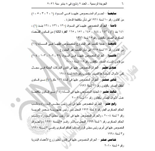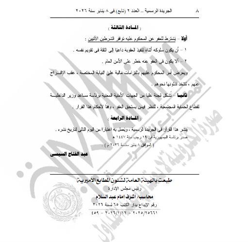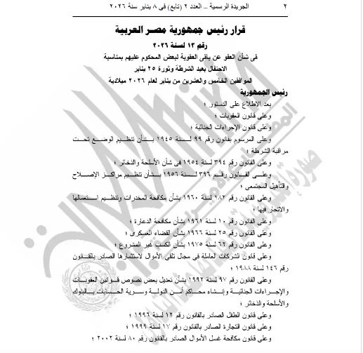 نشرت الجريدة الرسمية فى عددها رقم 2 (تابع) قرار جمهورى جديد للرئيس عبدالفتاح السيسى رقم 13 لسنة 2026 فى شأن العفو عن باقى العقوبة لبعض المحكوم عليهم بمناسبة الاحتفال بعيد الشرطة وثورة 25 يناير الموافقين الخامس والعشرين من يناير لعام 2026 ميلادية.