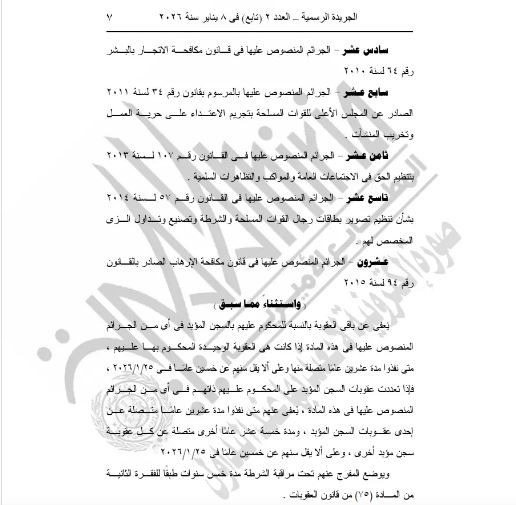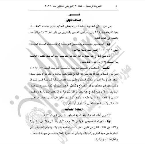 نصت المادة الأولى من قرار الرئيس السيسى على: يعفى عن باقى العقوبة السالبة للحرية لبعض المحكوم عليهم بمناسبة الاحتفال بعيد الشرطة وثورة 25 يناير الموافقين الخامس والعشرين من يناير لعام 2026 ميلادية، بالنسبة إلى الفئات التالية: